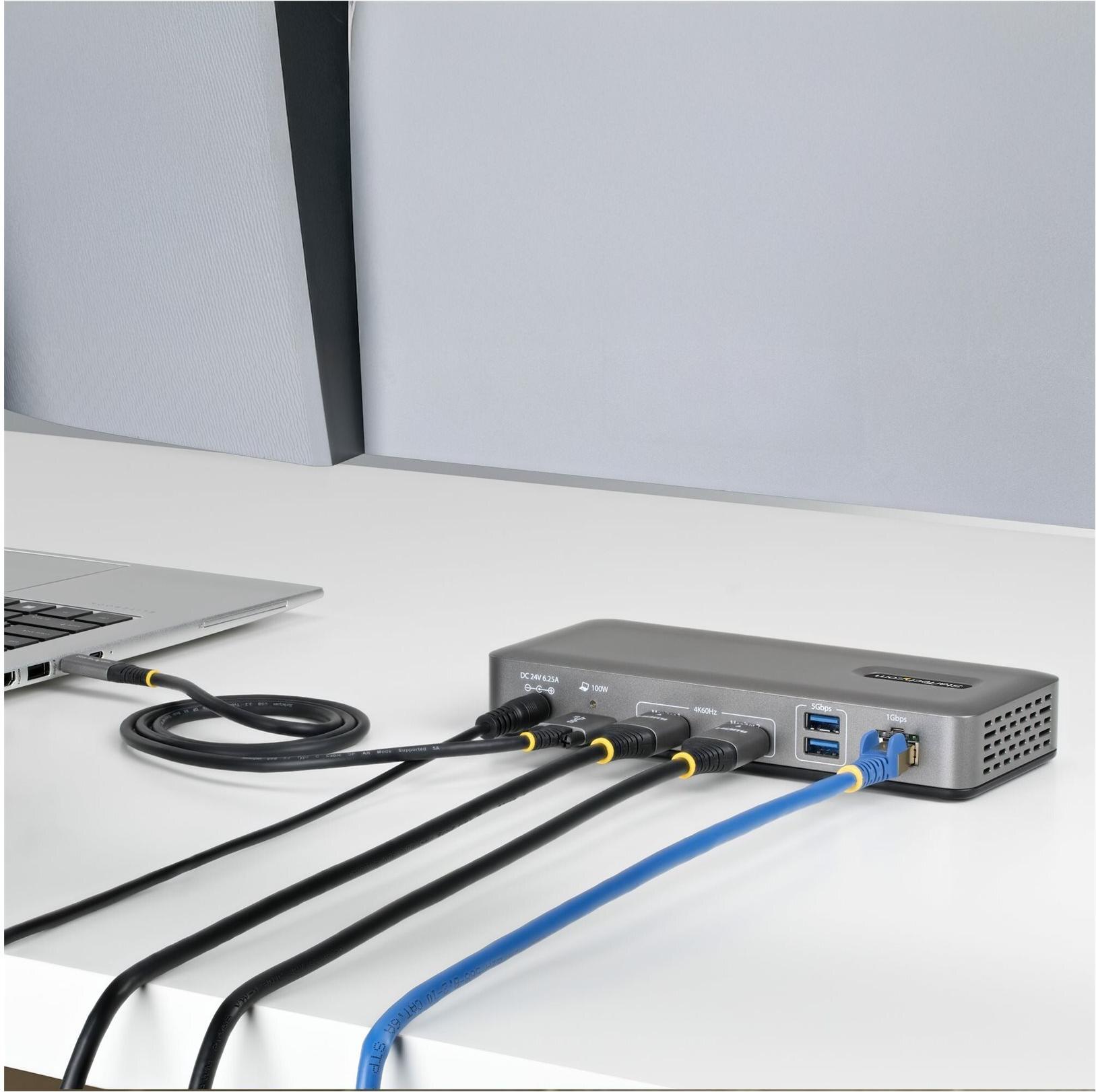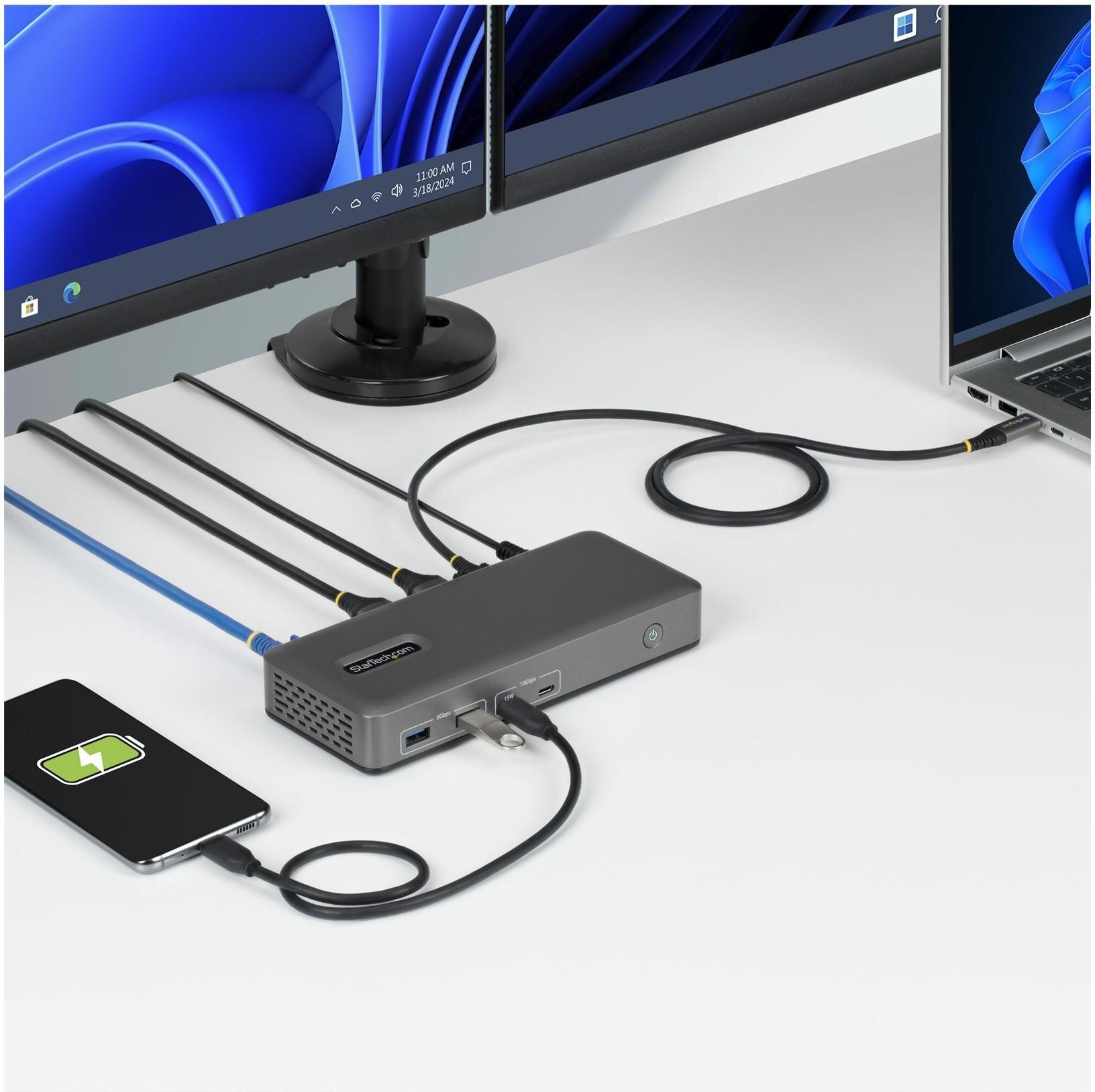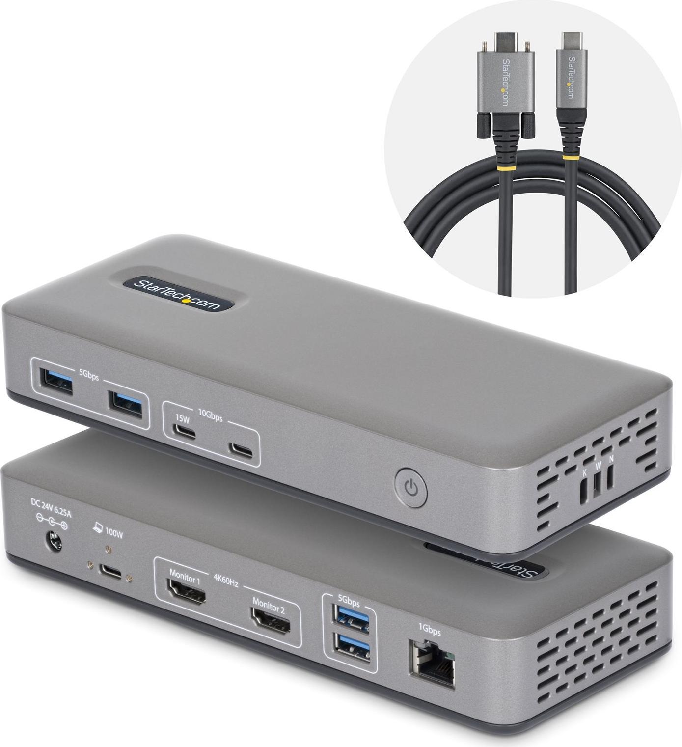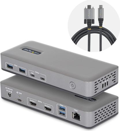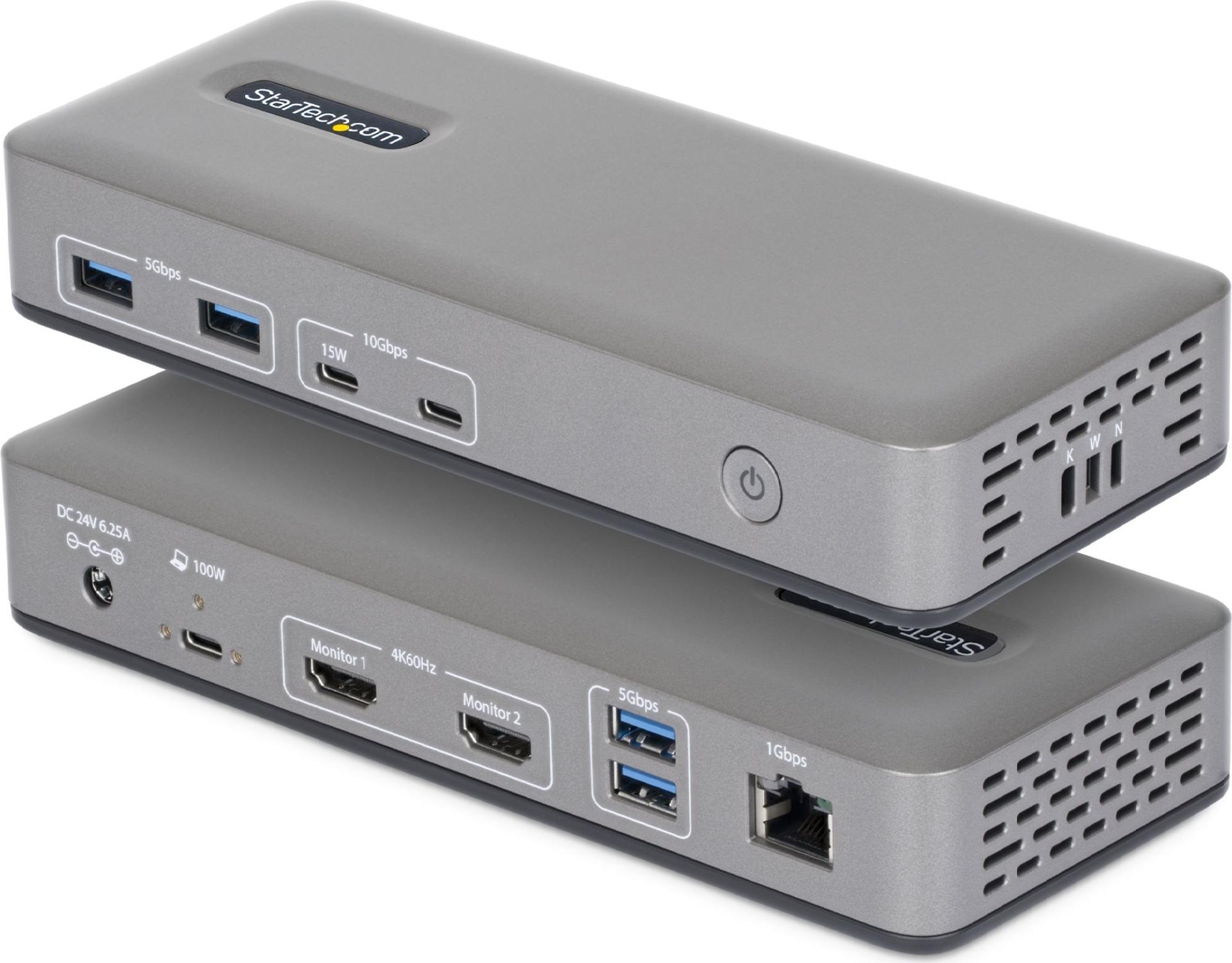 Schließen Sie bis zu zwei 4K 60Hz HDMI Displays über einen einzigen USB-C Port an und nutzen Sie zusätzlich USB-C, USB-A sowie Gigabit-Ethernet Konnektivität. Unkomprimiertes Video über USB-C Verbinden Sie bis zu zwei 4K 60Hz HDMI Monitore über einen einzelnen USB-C Port mit einem unkomprimierten Videosignal, das direkt von der nativen GPU des Laptops bereitgestellt wird. Ideal für anspruchsvolle Workflows mit hoher Bildqualität ganz ohne Software Kompression. Treiberlose Bereitstellung Unterstützt Plug-and-Play unter Windows ohne Treiber oder zusätzliche Software*. Entwickelt für skalierbare Zero Touch Rollouts in Shared Workspaces, Unternehmensumgebungen und BYOD Szenarien. Flexible High Speed I/O Die Dockingstation verfügt über 4× USB-A Ports mit 5 Gbps sowie 2× USB-C Ports mit 10 Gbps, davon einer mit 15W Power Delivery. Damit lassen sich sowohl ältere Peripheriegeräte als auch moderne Geräte mit hohem Datendurchsatz ohne Leistungseinbußen anbinden. Ein Gigabit Ethernet Port sorgt für eine zuverlässige kabelgebundene Netzwerkverbindung. Montage und Sicherheit Diese Multi Monitor Dockingstation bietet integrierte Lock Slots für erhöhte physische Sicherheit und unterstützt Oberflächen- oder VESA-Montage, um das Dock platzsparend und sicher zu befestigen. Montagezubehör ist separat erhältlich (SSPMSUDWM, DOCK-NUC-VESA-MOUNT, SSPMSVESA). *Hinweis: Nicht kompatibel mit macOS oder ChromeOS.