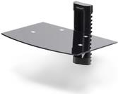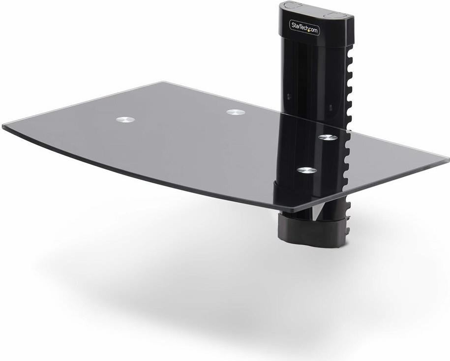 Die schwebende Regalkonsole für AV-Geräte verfügt über eine 5mm starke Ablage aus schwarzem Hartglas, die eine freie Fläche bietet, die sich ideal für die Organisation von AV-Komponenten unter oder über einem Fernseher oder Display eignet.