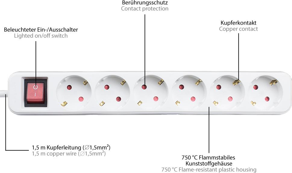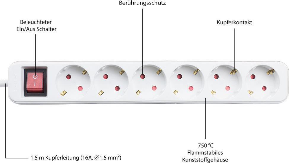 Die Steckdosenleisten von Good Connections mit sechs Schutzkontakt-Anschlüssen und beleuchtetem Schalter sind universell einsetzbar.