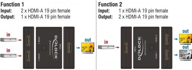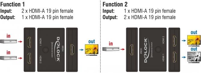 Dieser HDMI Umschalter von Delock ist ein manueller bidirektionaler Umschalter zur Verbindung verschiedener Geräte mit HDMI Anschluss, der zwei verschiedene Einsatzmöglichkeiten bietet.