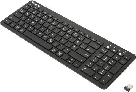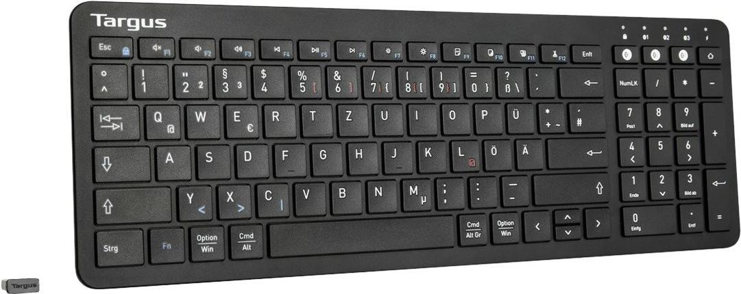 Bluetooth-Universal-Tastatur von Targus in deutscher Sprache mit antimikrobiellem Schutz. Diese Tastatur bietet universelle Kompatibilität und verfügt über Speicher für das Koppeln mit bis zu drei Geräten.