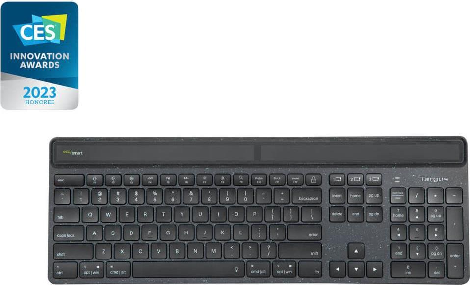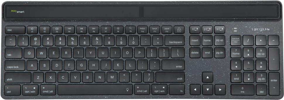 Das Targus Sustainable Energy Harvesting EcoSmart Keyboard kombiniert Bluetooth und fortschrittliche Solartechnologien mit recycelten Materialien in einer umweltfreundlichen Tastatur in Standardgröße. Diese Tastatur wird aus 85% recyceltem Material hergestellt und ist mit einem antimikrobiellen Schutz ausgestattet, der das Wachstum von Mikroorganismen verhindert und gleichzeitig zum Umweltschutz beiträgt. Sie wird in erster Linie durch Solarzellen betrieben, die so optimiert sind, dass sie Licht aus einer Vielzahl von Lichtverhältnissen (einschließlich künstlicher Innenbeleuchtung) auffangen können, und kann über Bluetooth SoC mit bis zu drei Geräten verbunden werden, was bedeutet, dass sie dank ihres extrem niedrigen Stromverbrauchs drei- bis viermal energieeffizienter ist als andere Bluetooth-Tastaturen. Außerdem verfügt diese Tastatur über den antimikrobiellen Schutz DefenseGuard von Targus. Im Gegensatz zu örtlich aufgetragenen Sprays ist diese DefenseGuard-Tastatur mit antimikrobiellen Zusätzen versehen, die sich nicht abnutzen oder abwaschen lassen und die während der gesamten Lebensdauer des Produkts wirken.Diese umweltbewusste, zum Patent angemeldete Tastatur wurde entwickelt, um Nachhaltigkeit im Arbeitsbereich und darüber hinaus zu verkörpern und ein komfortables Tipperlebnis zu bieten. Sie ist leicht, ergonomisch, hat einen extrem niedrigen Stromverbrauch, bietet Anschlussmöglichkeiten für mehrere Geräte und ist Plug-and-Play-kompatibel. Alles in allem eine hervorragende Ergänzung für Ihren Arbeitsbereich.