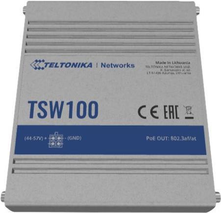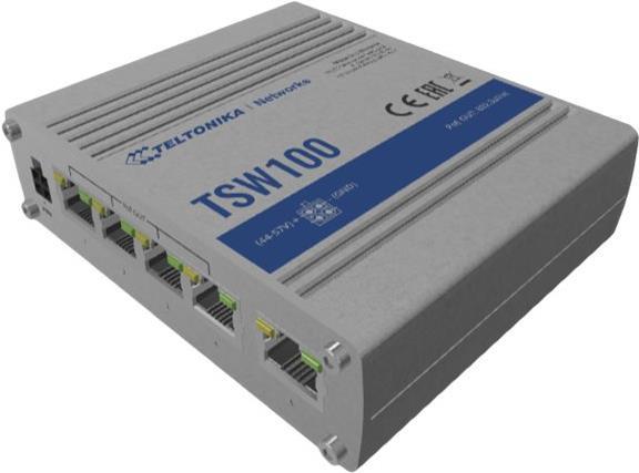 Der TSW100 ist ein industrieller Switch von Teltonika Networks ohne Management. Er ist mit fünf Gigabit-Ethernet-Ports ausgestattet, von denen vier die IEEE802.3af- und IEEE802.3at-Power-over-Ethernet-Standards (PoE) unterstützen.