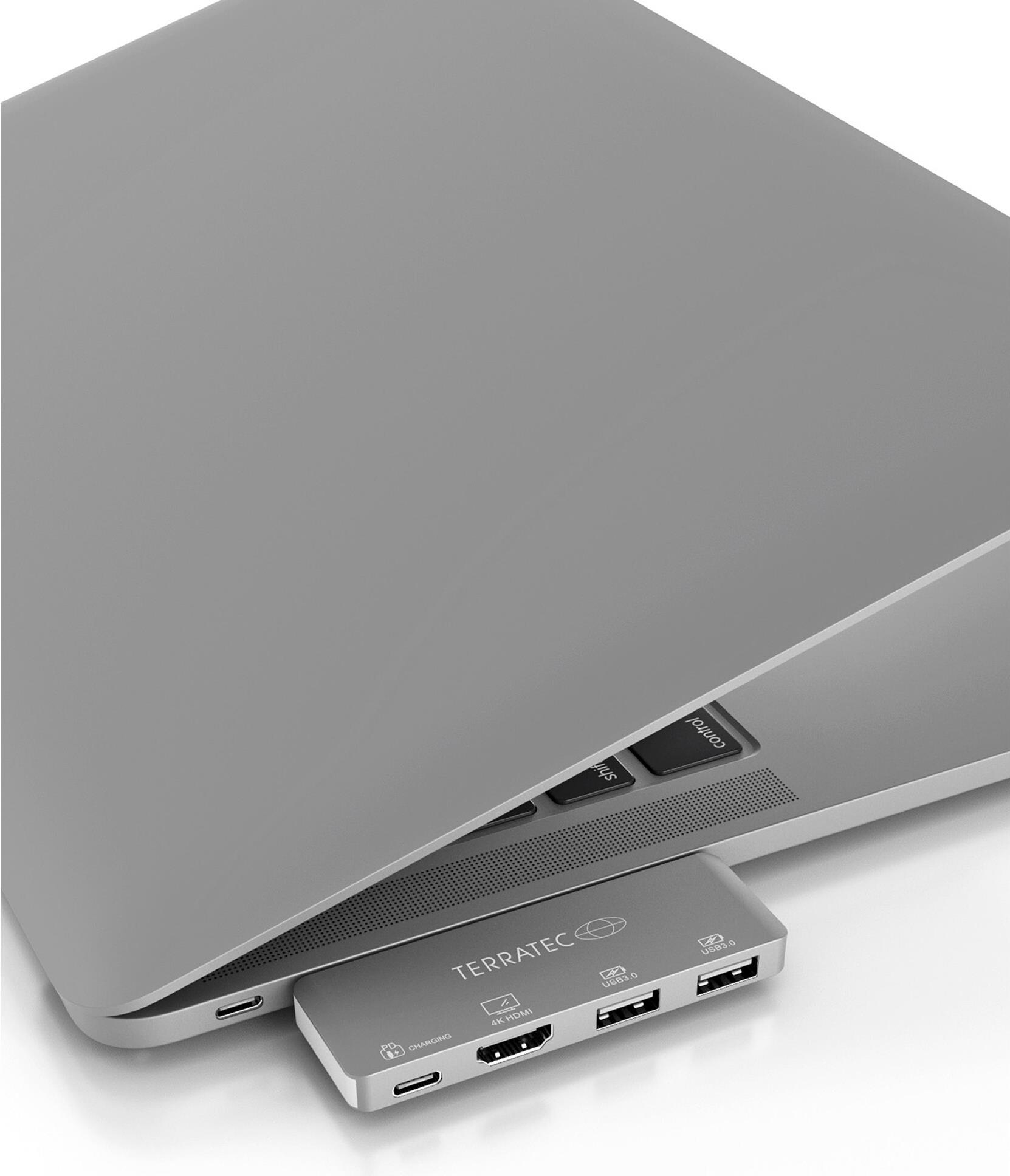 Der praktische TERRATEC CONNECT C4 ist das kompakte Multifunktionstool, um die Anschlussmöglichkeiten von MacBook, MacBook Pro, Chromebook und Windows Notebooks schnell und einfach zu erweitern. Der Adapter aus hochwertigem Aluminium wird über den USB Type-C Port angeschlossen und rüstet einen USB Type-C Port mit Power Delivery zum Laden sowie einen zusätzlichen HDMI-Port und zwei USB 3.0 Slots nach. So kann der Nutzer unter Verwendung nur eines USB Type-C Ports, bis zu vier externe Geräte anschließen und umgeht störende Anschlussengpässe zum Beispiel beim Laden.