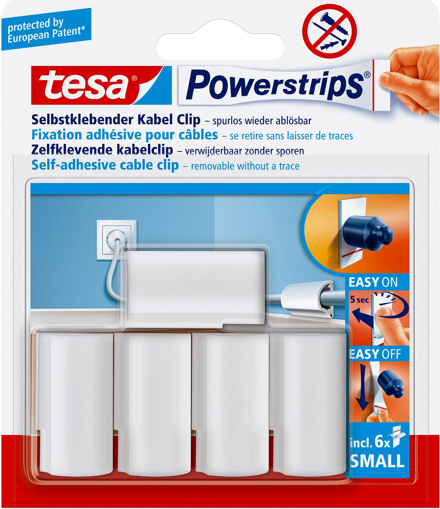Der tesa Powerstrips® Kabel-Clip für das einfache Fixieren von Kabeln im Haushalt, Home Office und am Arbeitsplatz.Bringt Ordnung in den KabelsalatFixiert Kabel bis zu einem Durchmesser von 8 mm*Einfach anzubringen ohne Schrauben, Dübel oder NägelJederzeit spurlos wieder ablösbar** durch die tesa Powerstrips® TechnologieDer Kabel-Clip ist mit neuem tesa Powerstrips® Small mehrfach verwendbarDer Powerstrip® wird vom Kabel-Clip vollständig verdeckt*Nicht geeignet für Vinyltapeten, antihaftbeschichtete Oberflächen, Styropor®, Schaumstoff, poröse Materialen**Spurlos ablösbar von glatten, ausreichend festen Untergründen