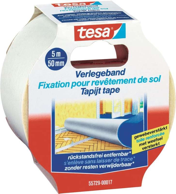 tesa Verlegeband, rückstandsfrei entfernbar, 50 mm x 5 m doppelseitiges Klebeband für alle Teppich- und PVC-Bodenbe - 1 Stück (55729-00017-00)