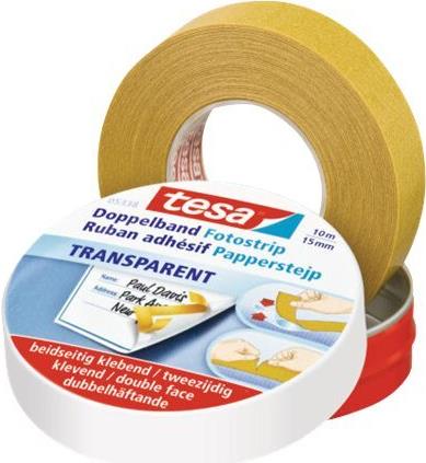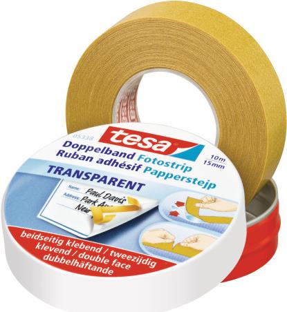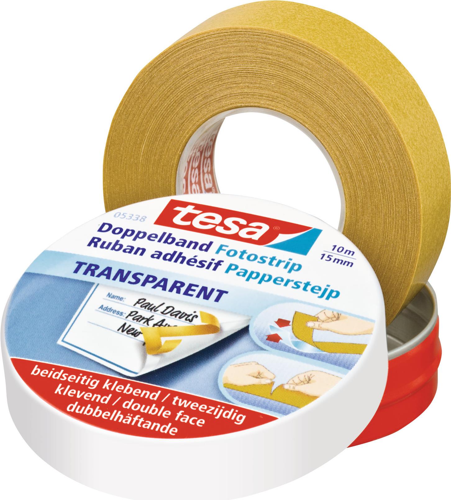 tesa Foto-Strip Doppelband, 15 mm x 10 m hauchdünnes beidseitiges Klebeband aus Vlies (05338-0-1)