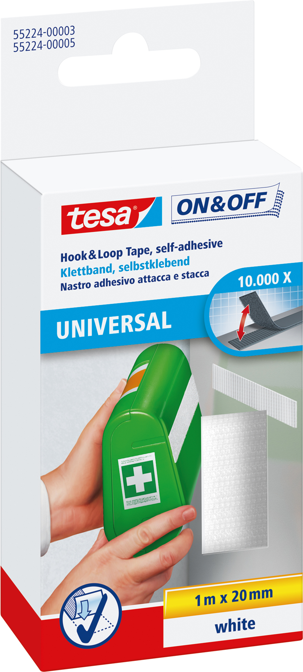 Die vielseitige Art zum Organisieren und Fixieren von leichten Gegenständen und Textilien. Für Kleidung, Heimtextilien und zum Dekorieren einsetzbar. tesa On & Off Allzweck-Produkte lassen sich 10.000 x öffnen und schließen.