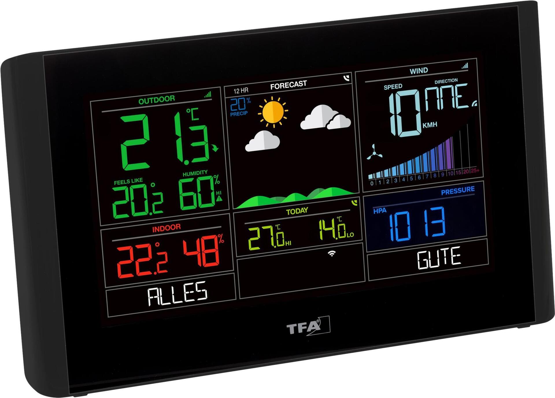 Die Station verfügt über zwei Außensender: Ein Thermo-Hygro-Sender kontrolliert die Außentemperatur und Luftfeuchtigkeit und ein Windmesser ermittelt die Windstärke am Aufstellort. Die Daten werden über eine Reichweite bis zu 100 m (im Freifeld) an die Basisstation gesendet. Ein integriertes elektronisches Barometer misst den Luftdruck und das farbige Wetterbild gibt eine Prognose für das kommende Wetter. Auch die Innentemperatur und Luftfeuchtigkeit haben Sie im Blick und können das Raumklima durch gezieltes Heizen und Lüften kontrollieren.