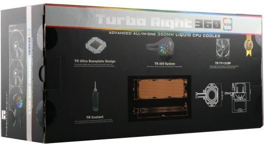 Der TurboRight Kupferkühler besteht aus komplett aus Kupfer und hat ein hochentwickeltes Design von Mikrokanälen (0,1mm), die auf der extra großen Kontaktfläche mit mehreren Kanälen für den direkten Flüssigkeitsfluss sorgt. Darüber hinaus wird die TurboRight Pumpe entkoppelt montiert, wodurch keine Vibrationen Belastungen für das Mainboard und die CPU entstehen sollen. Nicht nur ein neues Pumpen Design und Wasserblock werden genutzt, sondern auch einen hochverdichteten Design-Lamellenkühler. TurboRight hat den Trend zum Design eines "Rotating Blade" mit der ADD-LED-Beleuchtung im Inneren des Tanks vorangetrieben, die den Wasserfluss und den Kühlmittelstand anzeigen kann. TurboRight ist mehr als eine rotierende Klingenanzeige. Sie kann auch nachgefüllt werden. Die schon eingefüllte Flüssigkeit kann mit zusätzlichem TurboRight-Kühlmittel (100 ml) aufgefüllt werden. Diese Möglichkeit unterstützt die Freude am Design und die überraschend effiziente Leistung. Darüber hinaus ist das TurboRight-Kühlgebläsesystem mit zwei PWM-Lüftern vom Typ TY-121BP ausgestattet. Mit einer Drehzahl von 600 -1800 U/min, einer Förderleistung von 43,77 - 131,3 m³/H und einer damit entstehenden Lautstärke von 19 - 25 dB(A), sind diese Lüfter mehr als nur geeignet für diesen Kühlkörper.