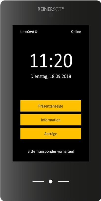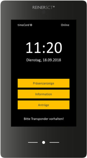 Am timeCard Terminal 3 buchen Mitarbeiter schnell und einfach Arbeitszeiten, Abwesenheiten und Projekte. Die Buchungen werden über das Netzwerk direkt an den timeCard Server übertragen. Urlaubs- und Überstundenkonten können tagesaktuell eingesehen werden.
