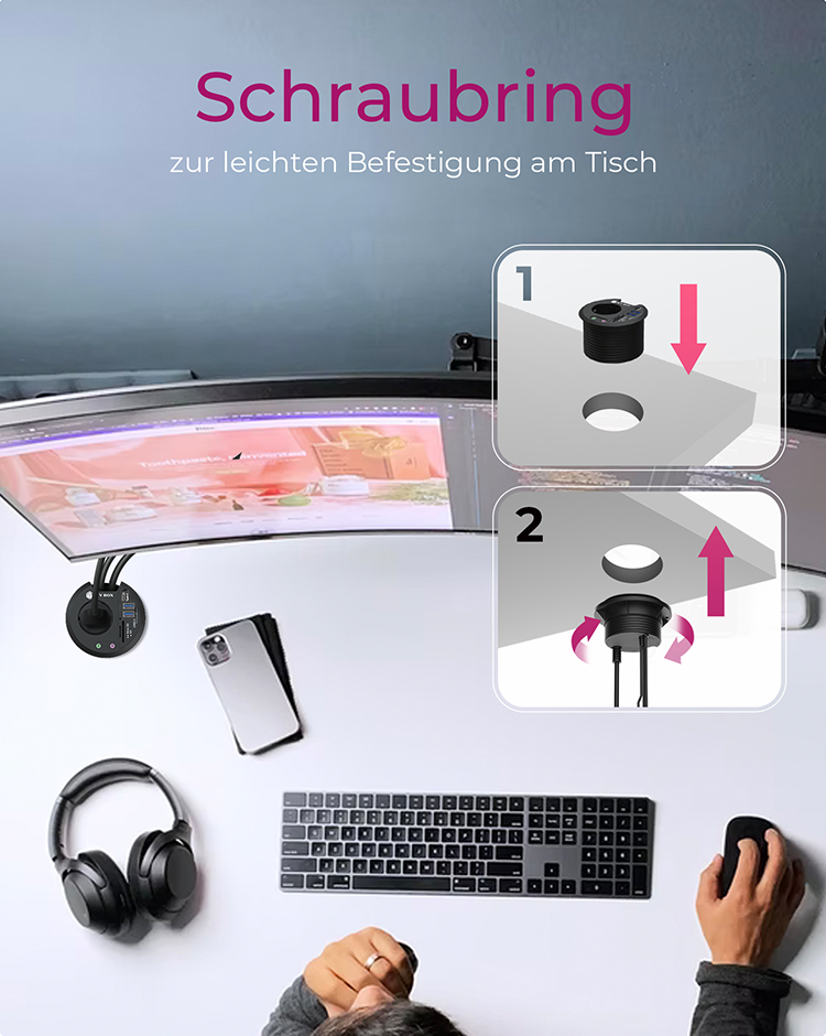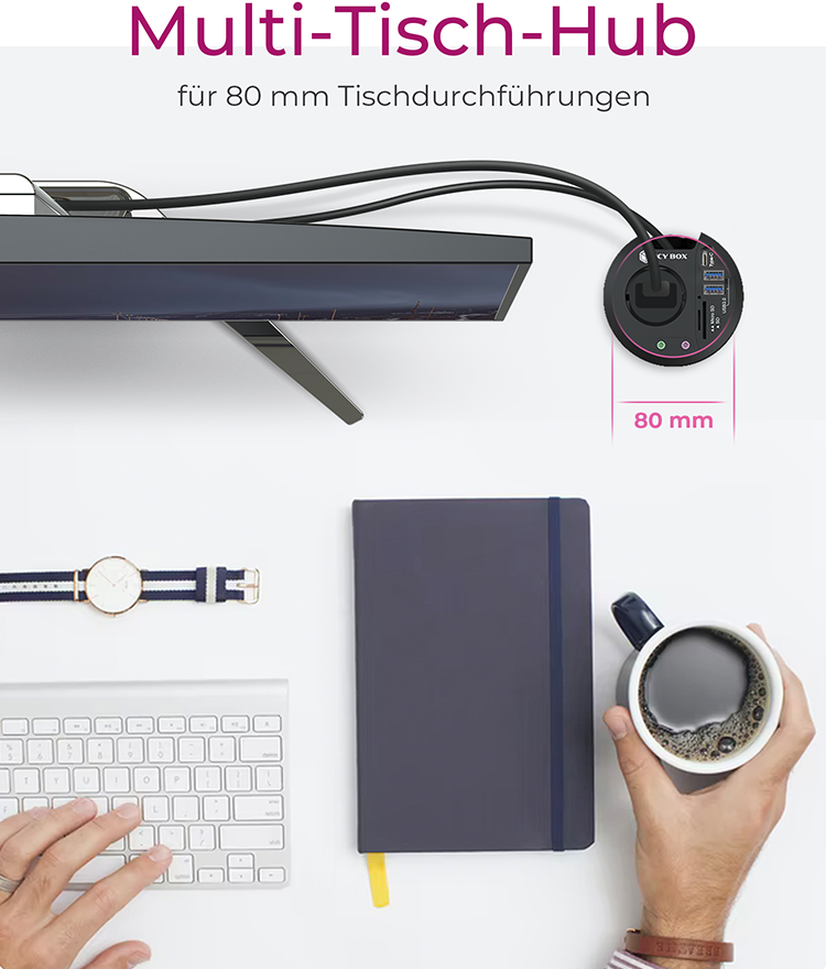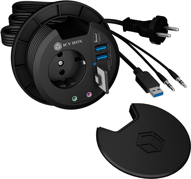 Tisch-Hub 2x USB 3.0 Type-A, 1x USB 3.0 Type-C®, SD/microSD Kartenleser mit Audio Ein-/Ausgang und Schuko-Steckdose, Ø 80 mm (IB-HUB1430-CR)