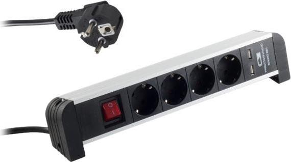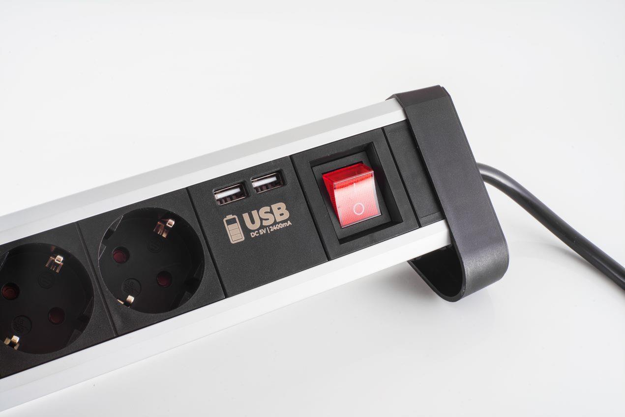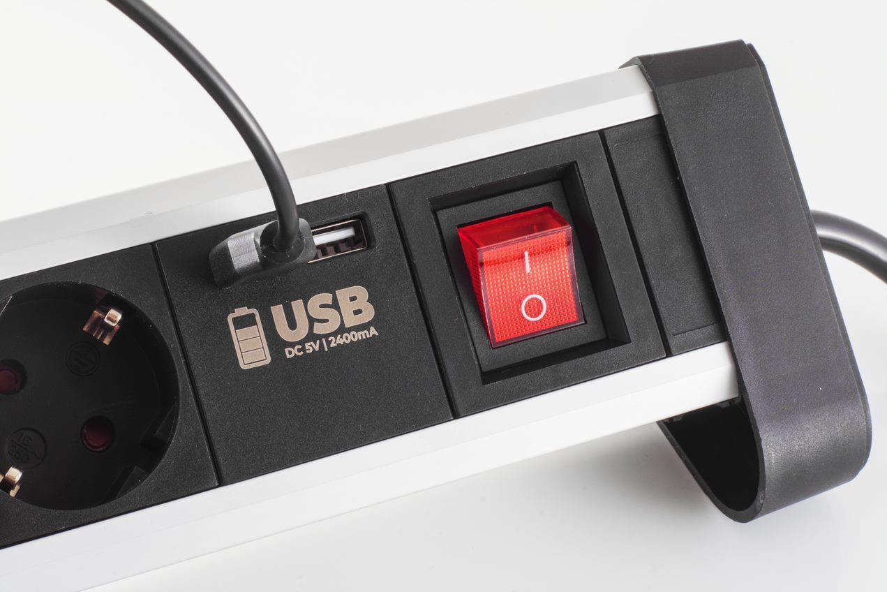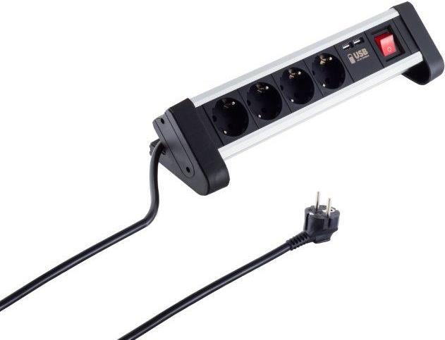 Tischsteckdosenleiste 4-fach mit USB Ladefunktion · 4-fach Tischsteckdosenleiste aus Aluminium mit USB Ladefunktion 2x 1000mA· Inklusive Befestigungsmaterial· Steckdosen angeordnet im 45?°-Winkel - so finden mehrere ...