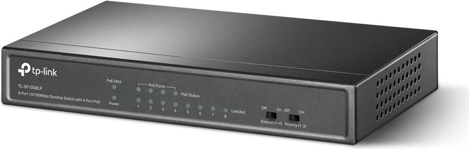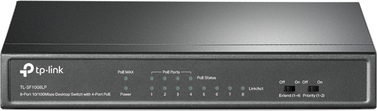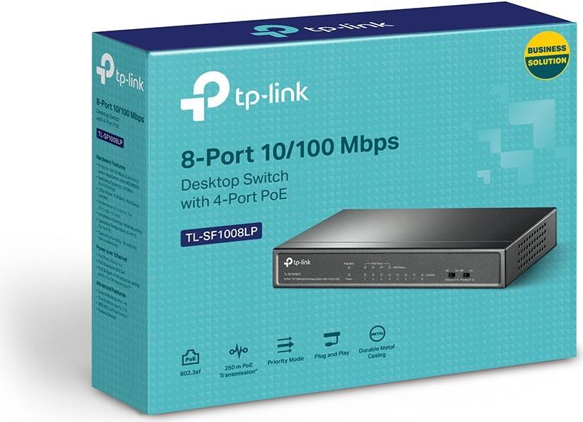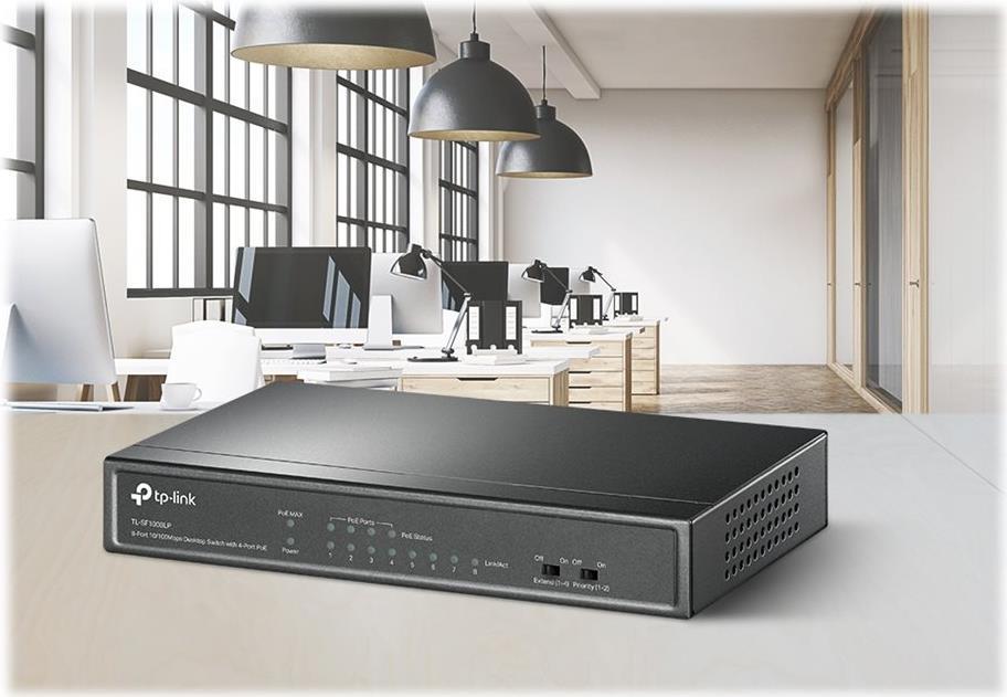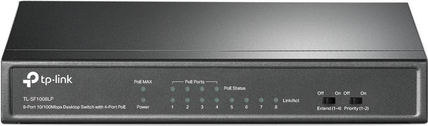 Der TP-Link TL-SF1008LP ist ein dedizierter 4-Port-PoE-Switch mit 41 W Budget für eine Vielzahl an Anwendungen. Die Einhaltung des 802.3af PoE-Standards unterstützt bis zu 15,4 W an jedem PoE-Port. Das gesamte 41-W-PoE-Leistungsbudget für die 4 × PoE-Ports ermöglicht eine breite Palette von Anwendungen, z. B. die Überwachung von Büros, Schlafsälen und kleinen Unternehmen. Es ist voll kompatibel mit IP-Kameras, Accesspoints, IP-Telefonen, Computern, Druckern und mehr.