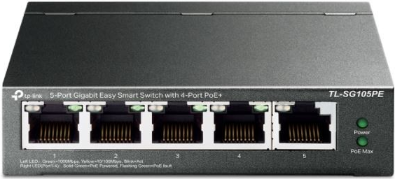 TP-LINK 5-PORT GIGAB EASY SMART SWITCH 5-Port Gigabit Easy Smart Switch with 4-Port PoE+PORT: 4× Gigabit PoE+ Ports, 1× Gigabit Non-PoE PortsSPEC: 802.3at/af, 65 W PoE Power, Desktop Steel CaseFEATURE: MTU/Port/Tag-based VLAN, QoS, IGMP Snooping, ...