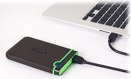Die robuste externe Festplatte StoreJet 25M3 von Transcend kombiniert höchste Stoßfestigkeit mit der USB 3.1 Gen 1-Schnittstelle und ermöglicht neben ultraschneller Datenübertragung einen starken Schutz vor Sturzschäden.