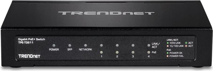 Der 6-Port Gigabit PoE+ Switch von TRENDnet, Modell TPE-TG611, reduziert die Geräte- und Installationskosten, indem er Daten und Strom über bestehende Ethernet-Kabel liefert. Dieser kleine Netzwerk-Switch mit SFP-Unterstützung bietet vier Gigabit-PoE+-Ports mit einer PoE-Gesamtleistung von insgesamt 65 Watt, einen Gigabit-Port und einen SFP-Steckplatz für Glasfaseranwendungen. Mit der PoE-Technologie benötigen Anwender nur einen Kabelsatz, um sowohl Daten als auch Strom bereitzustellen. Der kleine Netzwerk-Switch mit SFP-Unterstützung ermöglicht es Ihnen, PoE-Geräte wie Wireless Access Points, IP-Kameras, VoIP-Telefone, IP-Video-Encoder, Zugangskontrollen und mehr zu vernetzen. Der zusätzliche SFP-Steckplatz unterstützt sowohl Singlemode- als auch Multimode-Faser-SFP-Module für Langstrecken-Glasfaser-Netzwerkanwendungen.