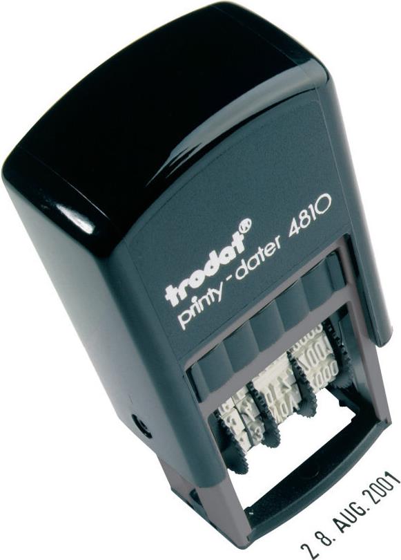 trodat Datumstempel Printy Dater 4810, selbstfärbend Abdruckmaße: 3,8 x 20 mm, Schrifthöhe: 3,8 mm, eingebautes schwarzes Stempelkissen, passendes Ersatzstempelkissen: 6/4910, Gehäusefarbe: schwarz, Maße: (B)41 x (T)24 x (H)76 mm (WEDO: 51 4810/trodat: 4810)