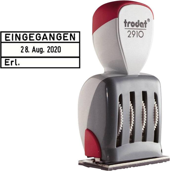 trodat Datumstempel 2910L \"EINGEGANGEN\" + 1 Feld ------------ für den Markt: D / L / A / CH ----------------- Abdruckgröße: 50 x 23 mm, mit Textplatte, Bänderdatumstempel mit Antriebsrädern zur Datumeinstellung, Metallkern mit Kunststoffummantelung, Maße: (B)60 x (T)35 x (H)102 mm (WEDO: 51 2914/trodat: 2910/B4)