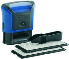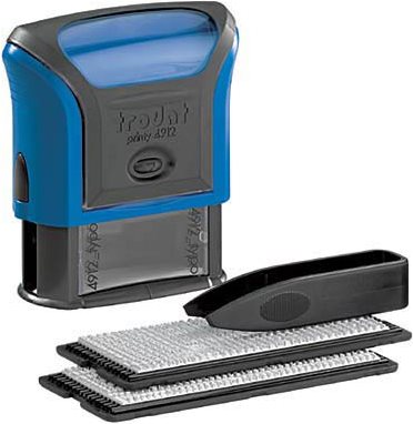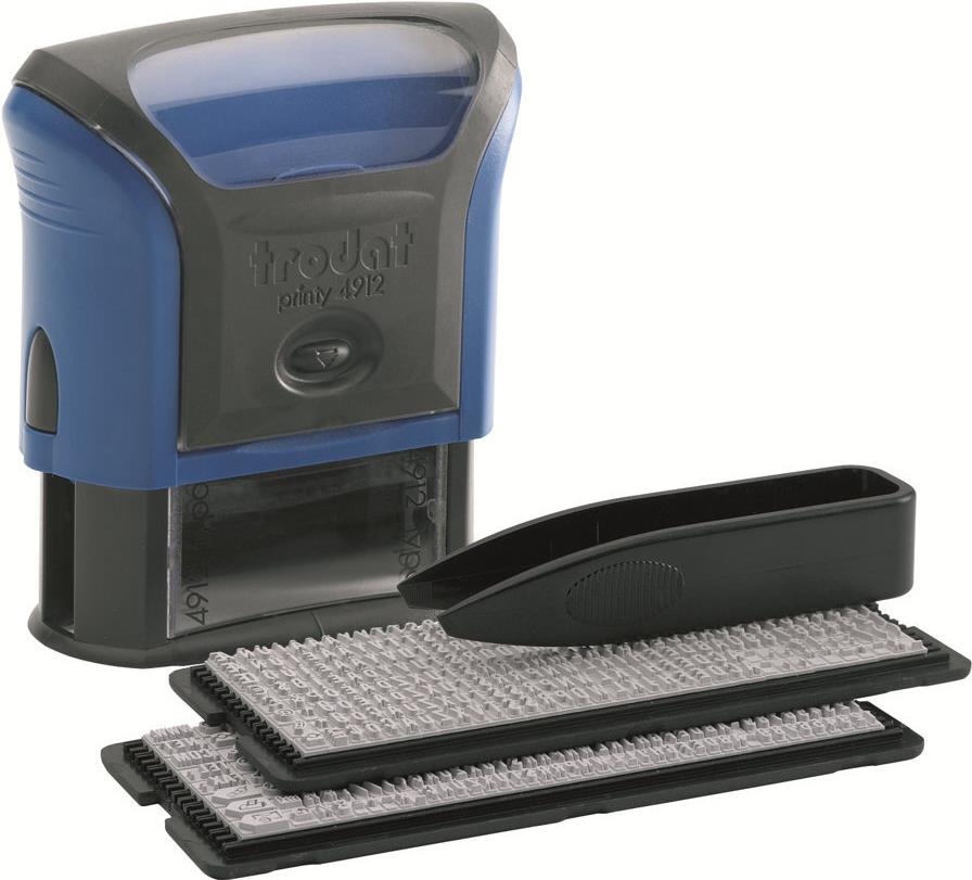 trodat Textstempelautomat Typo Printy Set 4912, 4 Zeilen ------------- für den Markt: D / L / A / CH ---------------- Stempel zum Selbersetzen, max. Abdruckgröße: 47 x 18 mm, selbstfärbend, Farbe: blau, Lieferung inkl.schwarzem Kissen, je 1 Set Gummitypen mit 3 mm und 4 mm Schrifthöhe, 1 Pin- zette, passendes Ersatzstempelkissen: 6/4912 (WEDO:51 49521)
