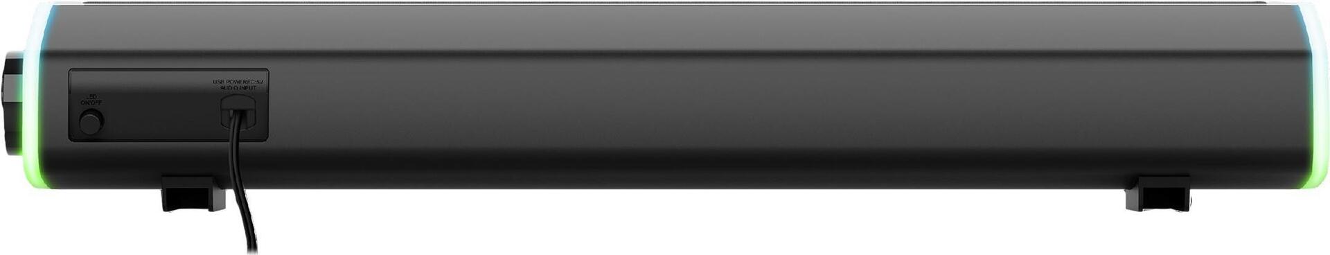 Mit einer Spitzenleistung von 12 W (6 W RMS) wird die Axon-Soundbar mit ihrem beeindruckenden Klangerlebnis das Niveau von Musik, Filmen und Games beträchtlich steigern.Produkttext[/head]Sound erlebenDie GXT 620 Axon Soundbar mit RGB-Beleuchtung macht dein Gaming-Audio zu einem echten Erlebnis. Die Regenbogenwellen-RGB-Beleuchtung passt sich an den Vibe deiner Lieblings-Games und deines Zubehörs an. Tauche in ein immersives, farbenfrohes Soundspektakel ein. RaumsparerDank ihres schlanken Designs passt die Soundbar problemlos unter einen TV oder PC-Monitor, wo sie mit einer Leistung von 12 Watt fetten Sound produziert. So erhältst du ein aufgeräumtes Gaming-Setup mit kristallklarem Audio.Intensiv und individuellÜber den großen, beleuchteten Drehregler kannst du die Lautstärke auch in den intensivsten Gaming-Sessions schnell und einfach anpassen. Die Stromversorgung erfolgt über ein USB-Kabel und über die 3,5-mm-Klinkenbuchse wird dein Sound angeschlossen. So kannst du Musik direkt von deinem Gerät abspielen - für ein noch individuelleres Erlebnis.[head]Hauptmerkmale