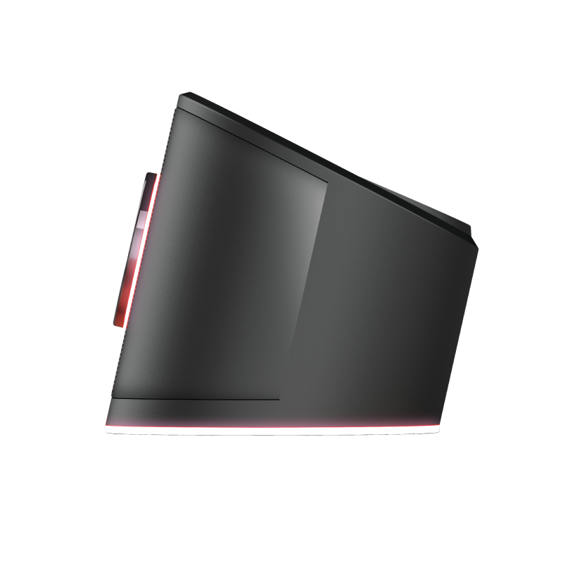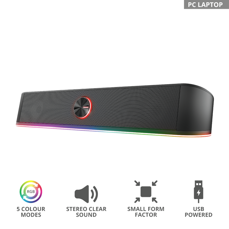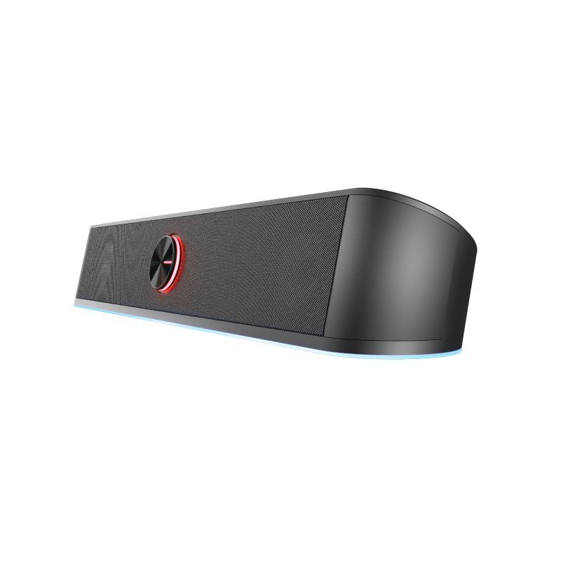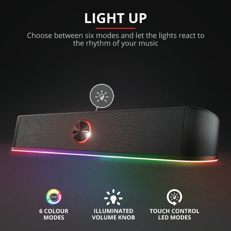 Stereo-Soundbar mit RGB-Beleuchtung und platzsparendem Design.
