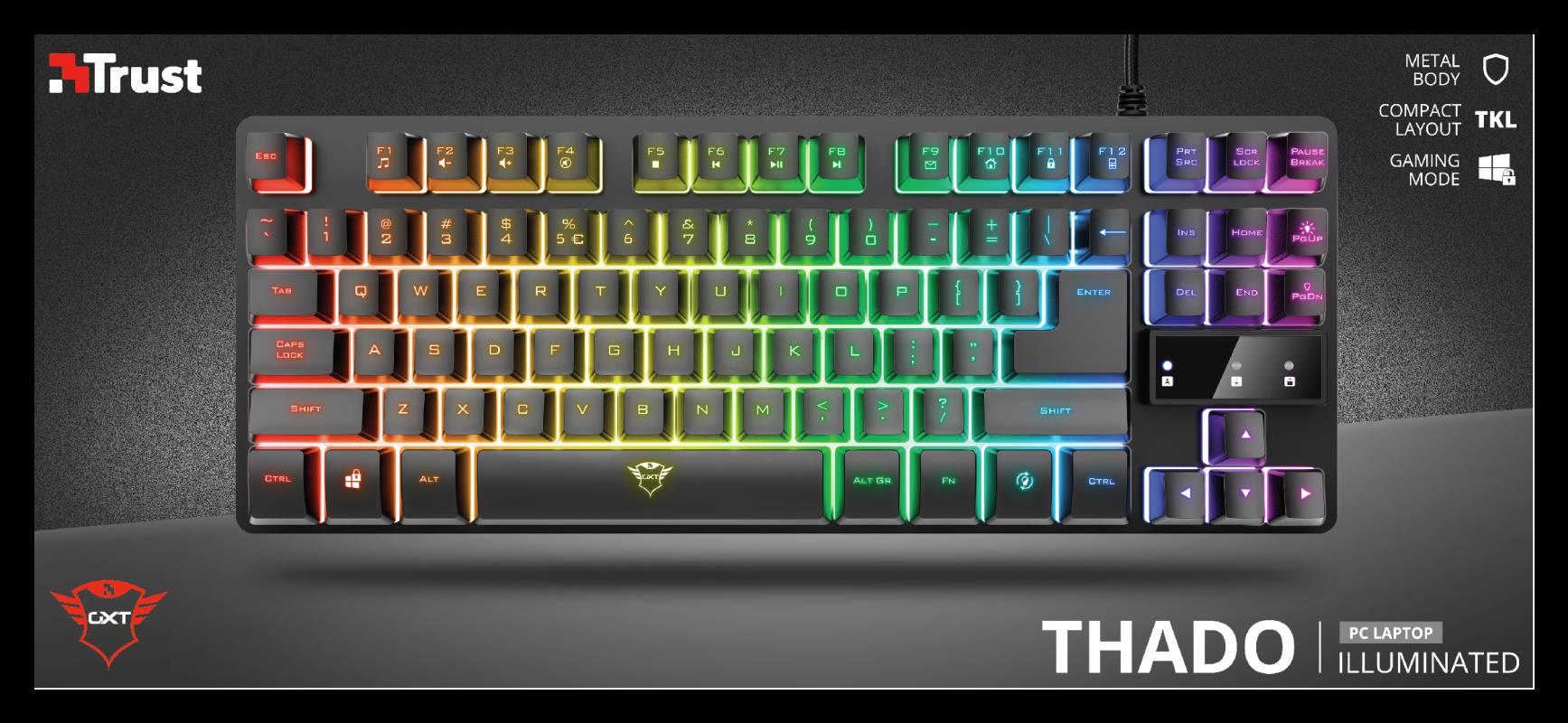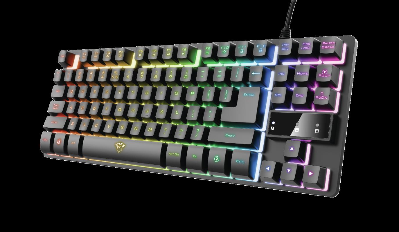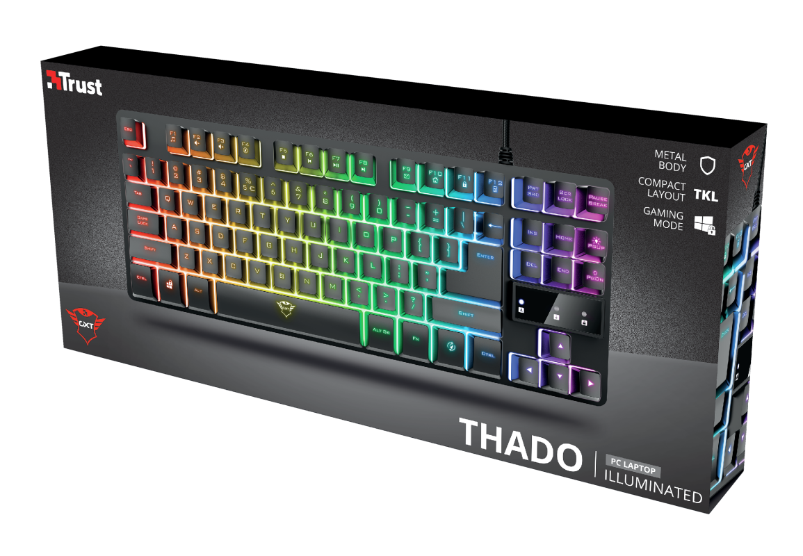 Als Tenkeyless-Gaming-Tastatur ist die Trust GXT 833 Thado 20 % kleiner als Keyboards mit Nummernblock und lässt sich so einfacher transportieren. Die Rückplatte aus Metall sorgt für Stabilität und die LED-Beleuchtung für Stimmung auf der Party.