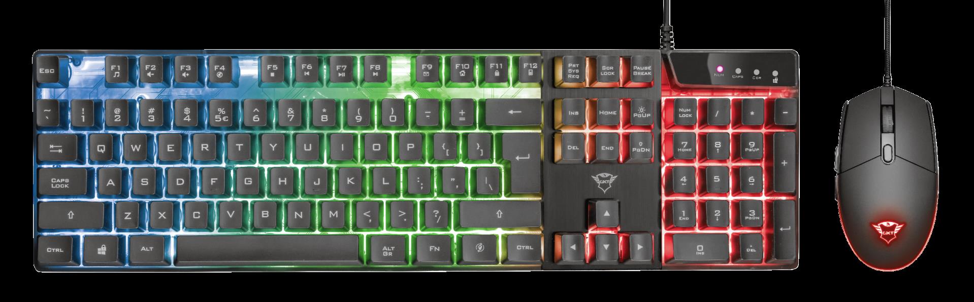 Die GXT 838 Azor-Tastatur und Maus funktionieren mit allen PCs und Laptops: stecken Sie sie einfach an und beginnen Sie Ihr Spiel. Richten Sie die Tastatur mit den rutschfesten Gummifüßen auf die passende Höhe ein und schon sind Sie bereit, um in voller Farbe zu spielen: die Tastatur bietet kombinierte LED-Farbmodi mit anpassbarer Helligkeit.Produkttext[/head]Beleuchtete Gaming-Tastatur mit eleganter und genauer Gaming-MausIn voller FarbeDie GXT 838 Azor-Tastatur und Maus funktionieren mit allen PCs und Laptops: stecken Sie sie einfach an und beginnen Sie Ihr Spiel. Richten Sie die Tastatur mit den rutschfesten Gummifüßen auf die passende Höhe ein und schon sind Sie bereit, um in voller Farbe zu spielen: die Tastatur bietet kombinierte LED-Farbmodi mit anpassbarer Helligkeit.Unter KontrolleDie Tastatur hat Originalgröße, das heißt, sie hat das optimale Layout für schnelle Tastatureingaben. Ihre Anti-Ghosting-Technologie sorgt dafür, dass Sie schnell und präzise spielen können: Sie behalten auch dann die Kontrolle, wenn Sie bis zu 8 Tasten gleichzeitig drücken.Spielmodus: einDie Tastatur verfügt über 12 Mediatasten für Direktzugriff, die es Ihnen ermöglichen, Ihre Musik oder die Beleuchtung der Tastatur zu steuern. Sie können mit den Tasten Ihrer Tastatur sogar Musik direkt abspielen, eine Suche starten oder eine andere Seite aufrufen. Der spezielle Spielmodusschalter sorgt dafür, dass Sie nicht versehentlich zu Ihrem Desktop zurückschalten, wenn Sie auf die Windows-Taste kommen: diese Taste ist für die Dauer Ihrer Gaming-Sessions deaktiviert.Schnelle ReaktionenMit 6 reaktionsschnellen Tasten und beleuchtetem Design haben Sie die Gaming-Siege in Ihrer Hand. Wählen Sie mit der DPI-Wähltaste Ihre bevorzugte Geschwindigkeit (800-3000 DPI) und die ständig umlaufenden Farben erwecken Ihr Gaming-Setup zum Leben![head]Hauptmerkmale