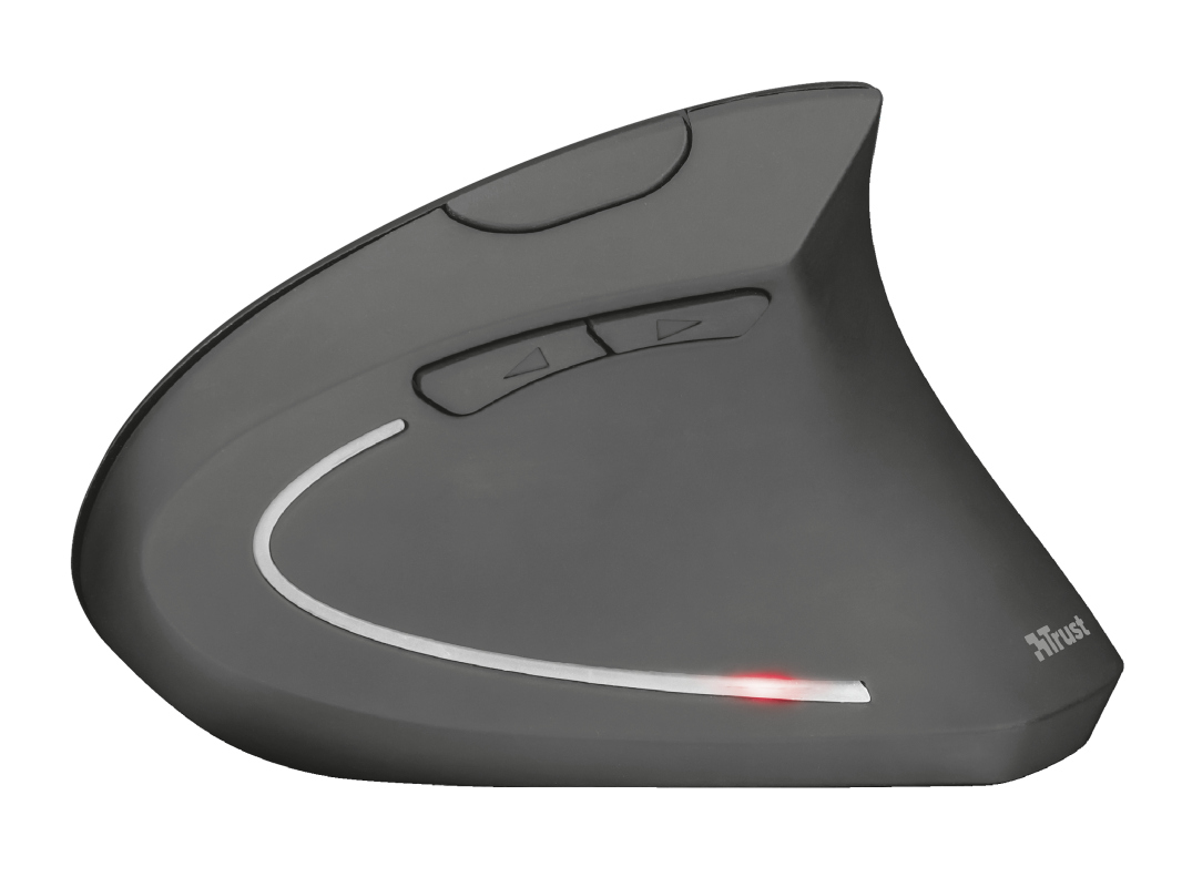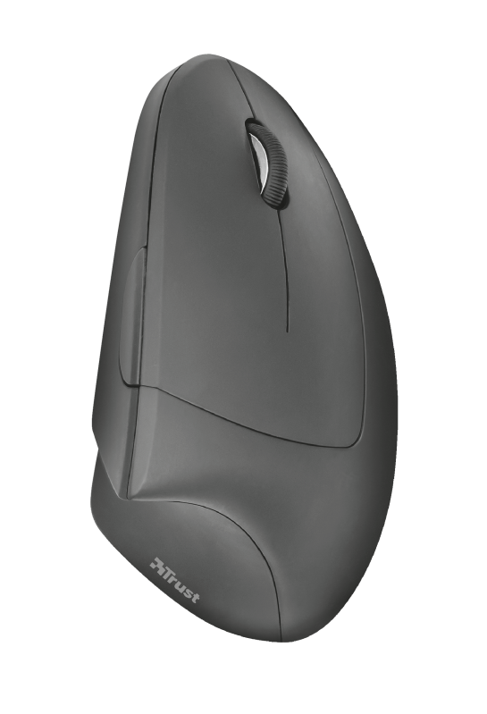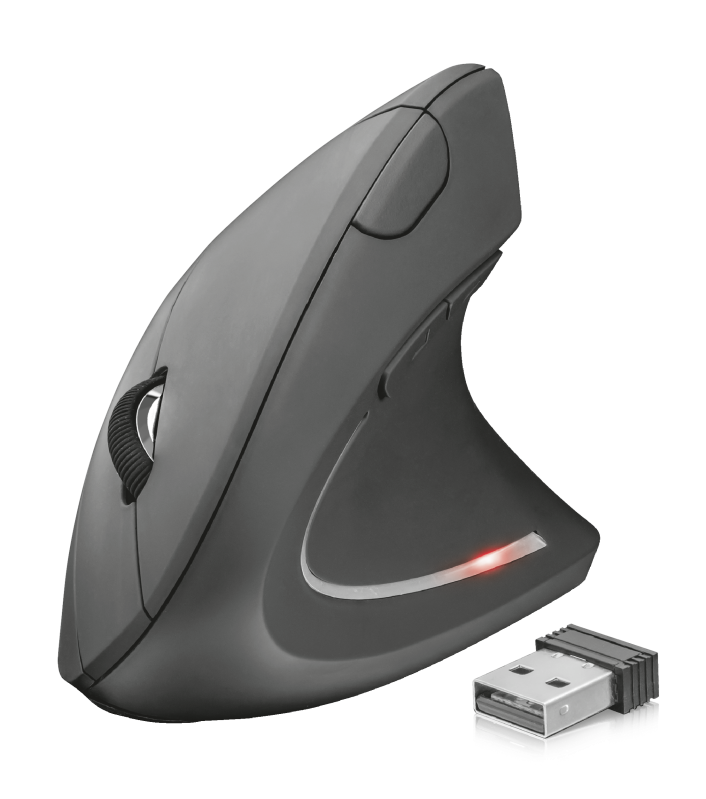 Funkmaus mit ergonomischem vertikalem Design für reduzierte Beanspruchung von Arm und Handgelenk.