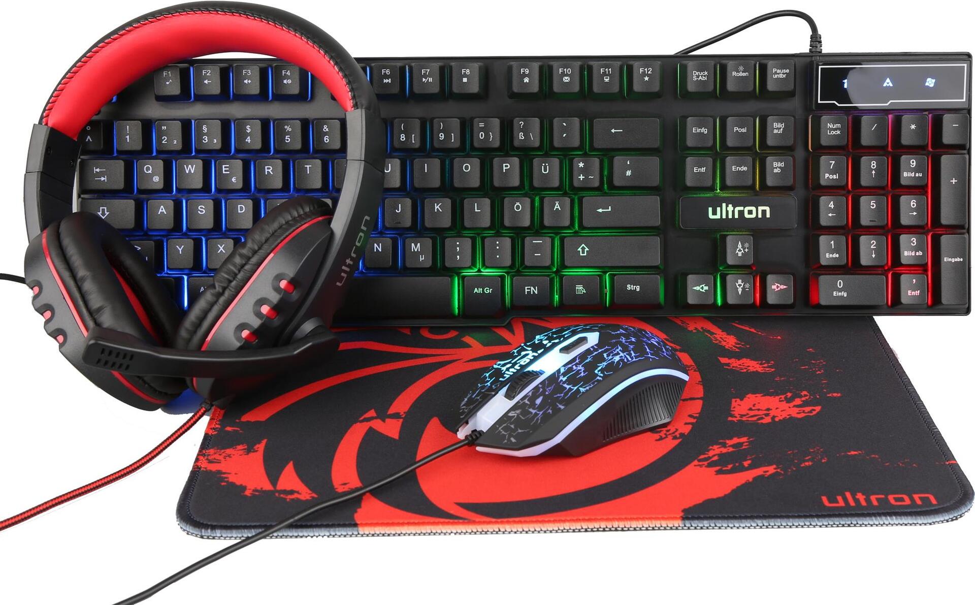 Das 4 in 1 Gaming Set Ultron HAWK Gaming Kit bietet alles, was passionierte Gamer zum Zocken benötigen. Tastatur und Maus eignen sich dank LED-Beleuchtung für übersichtliches Gamen bis tief in die Nacht. Mit dem Gaming Headset mit Mikrofon genießt der Spieler das volle Klangerlebnis und bleibt mit seinen Mitspielern in Kontakt. Das große Gaming Mousepad sorgt mit besten Gleiteigenschaften für blitzschnelle Spielzüge.