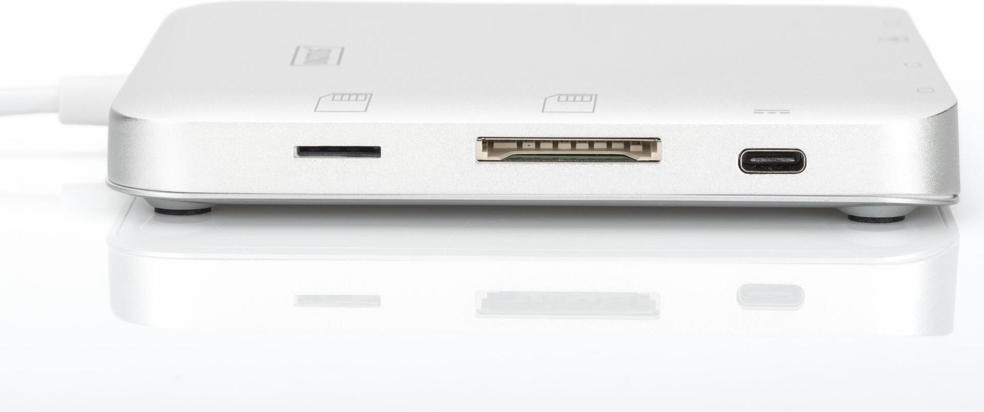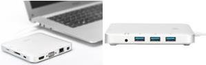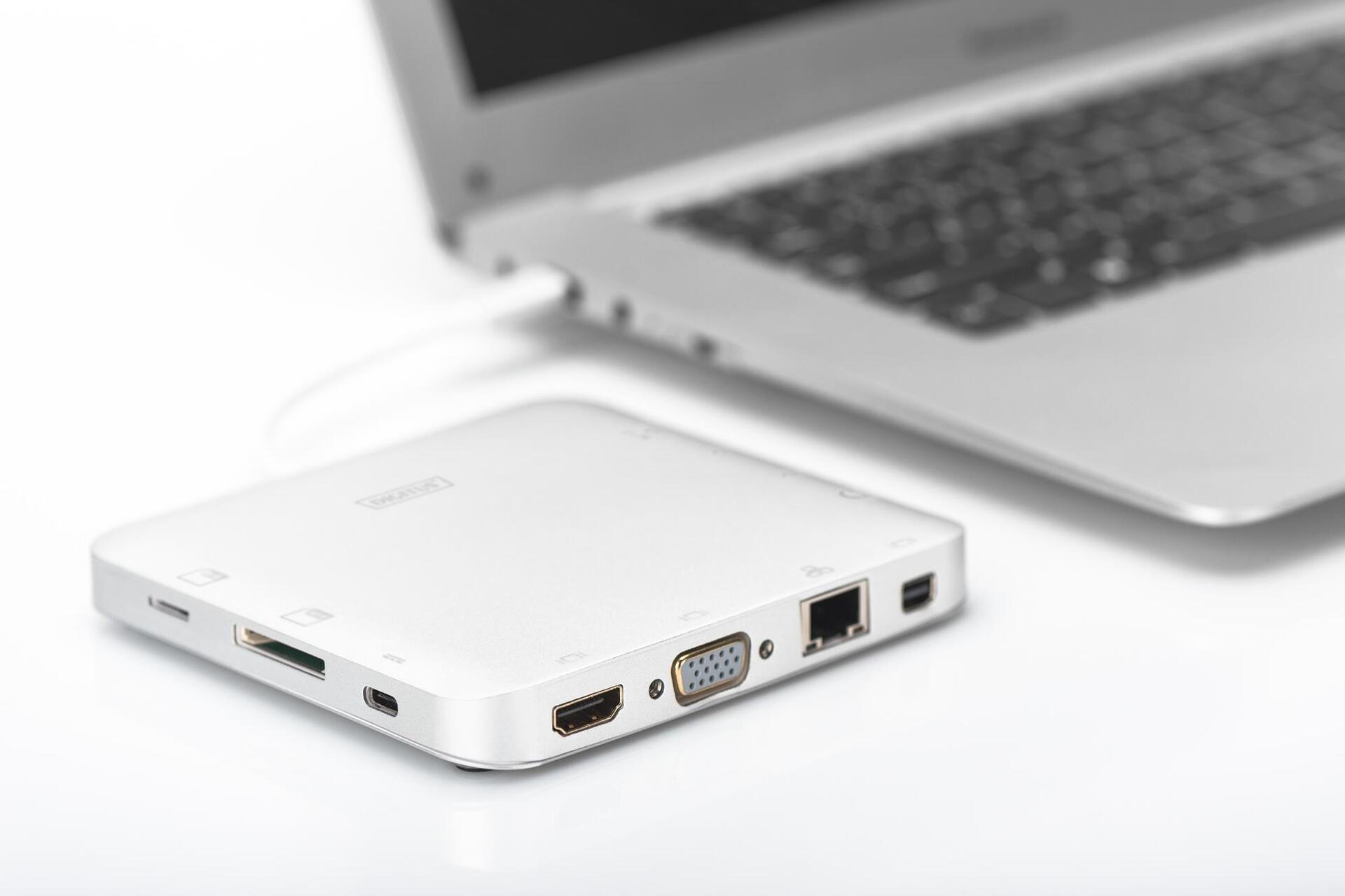 Die vollfunktionale Universal Docking Station, USB Typ-C von Digitus bietet Ihnen alles um einen voll ausgestatteten Arbeitsplatz zu schaffen. Sie bietet drei Video-Schnittstellen (HDMI, Mini DP, VGA) wobei zwei Monitore zeitgleich betrieben werden können. Die höchtsmögliche unterstützte Auflösung hierbei: Brilliantes UHD (4K2K/30 Hz). Dazu bietet sie drei USB 3.0 Anschlüsse, wobei ein Port (5 V/1,5 A) zusätzlich eine Ladefunktion für Mobilgeräte verspricht. Ergänzt werden die USB-Schnittstellen durch einen USB-C Port mit Power Delivery (PD 2.0) Funktionalität. Ebenso verbaut sind zwei Kartenleser (MicroSD, SDHC, SDXC/MMC). Über den Gigabit Ethernet Anschluss lässt sich ihr Notebook auch per Kabel in Ihr Netzwerk einbinden. Abgerundet wir das Ganze durch einen Stereo Audio-Anschluss. Erweitern Sie Ihr Notebook um 11 weitere Anschlüsse über nur einen USB-C Port - mit der multifunktionalen Universal Dockstation USB Typ-C.