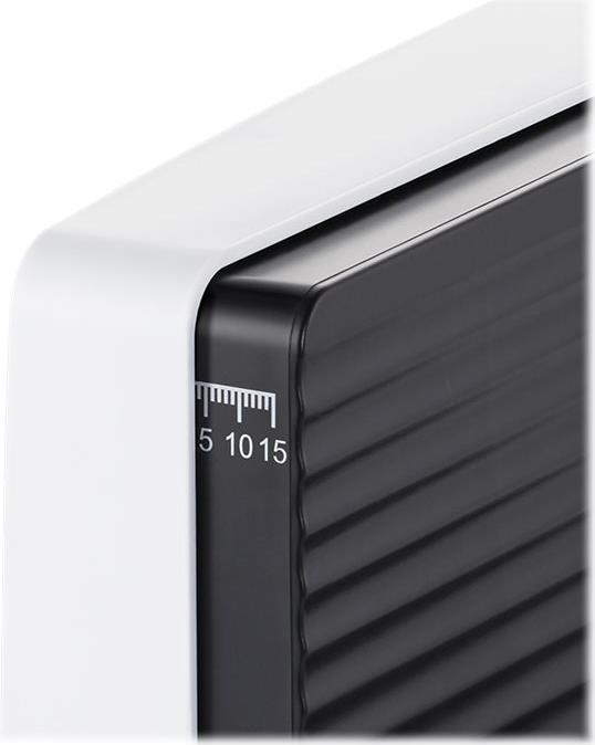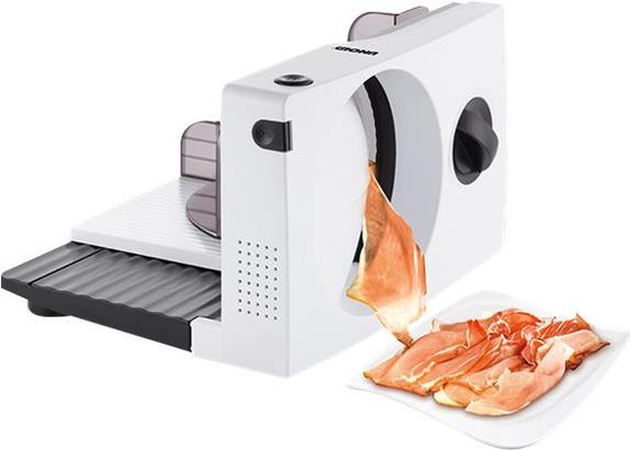 Von A wie Aufschnitt bis Z wie Zucchini: Wenn verschiedenste Lebensmittel in Scheiben geschnitten werden sollen, ist der Allesschneider Curve White unentbehrlich. Und wird er gerade nicht benötigt, lässt er sich ganz einfach zusammenklappen und platzsparend im Küchenschrank unterbringen. Durch die integrierte Kabelaufbewahrung wird dafür das circa 135 Zentimeter lange Kabel perfekt verstaut.Mit dem einfach entnehmbaren Edelstahl-Wellenschliffmesser (ca. 17 Zentimeter Durchmesser) liefert der Allesschneider Curve White gleichmäßige Scheiben. Ob hauchfein bei Salami, Schinken und Co. oder dicker für knusperfrisches Brot oder köstlichen Braten: Die Schnittbreite kann stufenlos von 0 bis 15 Millimeter eingestellt werden.In Sachen Sicherheit lässt der Allesschneider keine Wünsche offen. Durch seine Antirutschfüße hat er sicheren Stand auf der Arbeitsfläche; per Sicherheitsschalter ist die Kindersicherung gewährleistet. Und der abnehmbare Restehalter mit Fingerschutz sorgt für das problemlose Schneiden ohne Reststücke - ohne Gefahr für die Fingerkuppen!