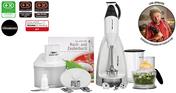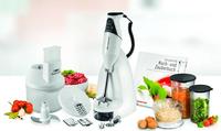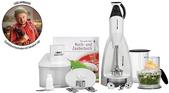 Für die finessenreiche Küche liefert der ESGE-Zauberstab M 200 Superbox das perfekte Werkzeug! Denn nicht nur Multimesser, Schlagscheibe und Quirlscheibe gehören zur Ausstattung! Da ist auch noch die Zauberette, mit der Lebensmittel zerkleinert, geraspelt, gerieben oder in Scheiben geschnitten werden können. Und der Zerkleinerer übernimmt das Zerkleinern oder Mahlen von Kräutern, Kaffeebohnen vieles mehr. Durch die Aufsteckzentrierung lässt sich das Multitalent ganz einfach mit den Zubehörteilen bestücken und durch den Soft-Touch-Membran-Schalter werden 12.000 oder 17.000 Umdrehungen pro Minute mit starken 200 Watt erzeugt - dafür sorgt der robuste, langlebige AC-Motor.
