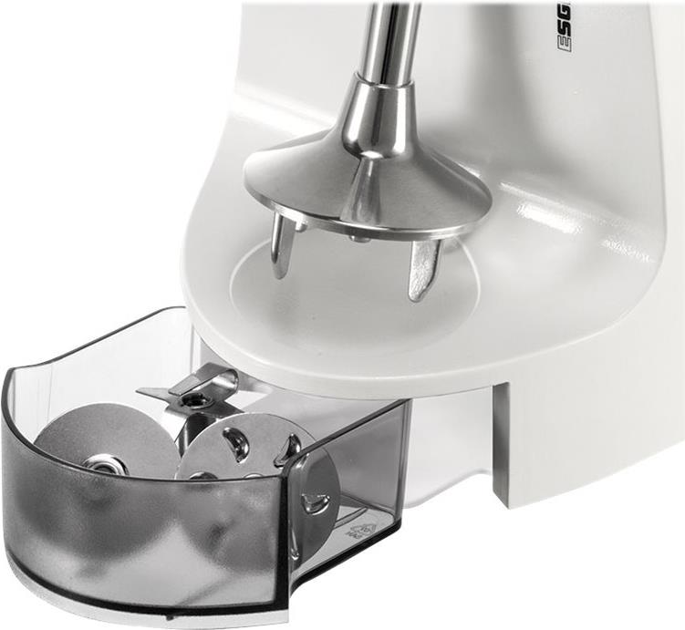 Griffbereit "geparkt" wird der ESGE-Zauberstab M 200 Superbox mit seinem bis zu 150 Zentimeter ausziehbarem Spiralkabel in der ESGE-Zauberbasis, in deren integrierter Schublade die Zubehör-Messer und -scheiben griffbereit untergebracht werden können. Auch der Zerkleinerer lässt sich platzsparend darin aufbewahren.