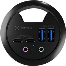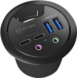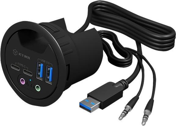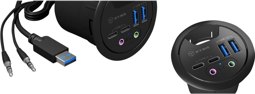 Der IB-Hub1403B sorgt für frustfreie USB-Anschlüssen auf Tischhöhe. Auch technologisch ist er mit zwei Type-C Anschlüssen auf der Höhe. Die ursprüngliche Funktion der Kabeldurchführung bleibt erhalten, dank Ausparung für Kabel.