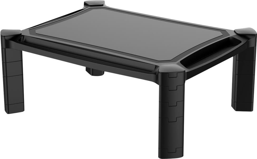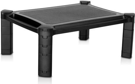 Mit dem höhenverstellbaren Monitorständer von V7 bringen Sie Ihren Monitor auf eine ergonomisch korrekte Arbeitshöhe und schaffen Platz auf dem Schreibtisch. Die Höhe lässt sich über praktische Säulenfüße einstellen, sodass Ihr Monitor auf dem modern gehaltenen Ständer immer optimal positioniert ist. Unter dem Ständer bleibt dank der Säulenfüße viel Platz für einen kleinen Laptop oder andere Utensilien. Der Ständer trägt bis zu 10 kg und die Standfläche der Säulen ist rutschfest, sodass Ihr Monitor oder andere elektronische Geräte bei der Arbeit sicher stehen. Eine Kabelführung lässt lästige Kabel verschwinden und in den praktischen Ablagen vorne und an den Seiten lassen sich Stufte und andere Dinge verstauen.