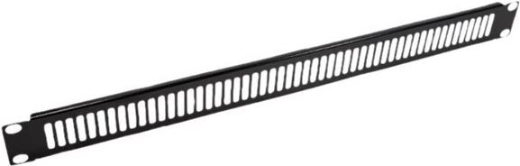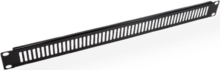19"-Blindplatte mit Belüftungsschlitzen, lackiert in RAL 9005 (schwarz), zum Abdecken nicht benötigter Einbauplätze • 19"-Blindblende mit einer Höheneinheit (1HE) und Belüftungsschlitzen • RAL 9005 Lackierung, schwarz • Zum Einsatz in 19" Serverschränken, um nicht benötigte Einbauplätze zu verdecken • Metall.