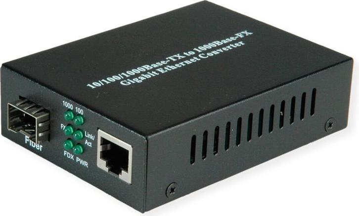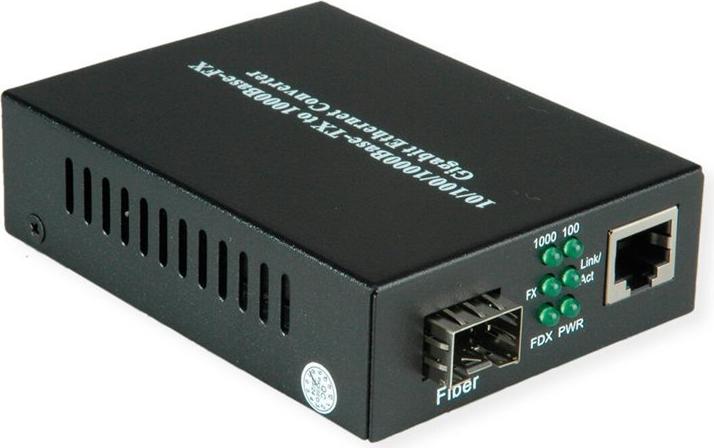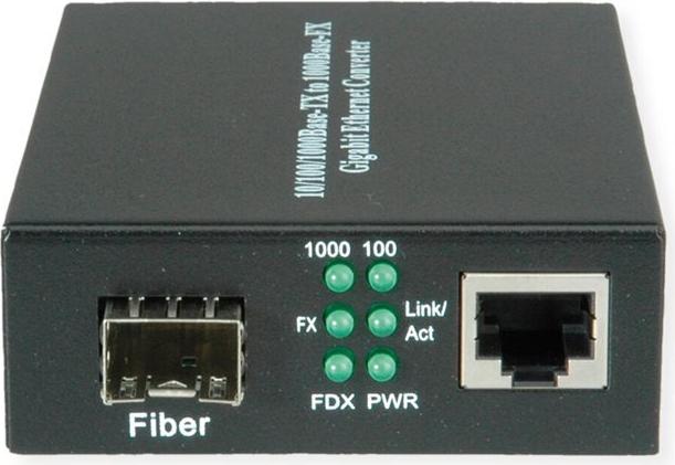 Konverter zur Umsetzung eines 10/100/1000 Mbit/s TP-Ports auf Gigabit Ethernet Glasfaser - Single Mode oder Multimode, je nach eingesetztem SFP. Anschluss TP-Seite: IEEE 802.3 10Base-T, IEEE 802.3u 100Base-TX, IEEE 802.3z 1000Base-TX: Geschirmte RJ-45 Buchse Unterstützt Auto MDI/MDI-X Erkennung, Auto-Negotiation für Geschwindigkeit sowie automatische Duplex Erkennung für 10/100Mbit/s (full- oder half-duplex) Anschluss LWL-Seite: SFP-Slot zur Aufnahme eines miniGBICs für 1000Base-FX LEDs für TP Datenrate, LWL Datenrate, FX und TX Link/Activity, Power Status Umgebung: Betriebstemperatur 0 - 65° C; 5 - 90 % nicht kondensierend Abmessungen (BxTxH): 71 x 94 x 26 mm Die Stromversorgung erfolgt über ein mitgeliefertes externes Netzteil (5V DC); Stromverbrauch unter 3W.