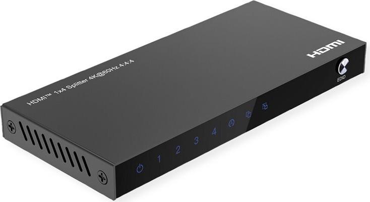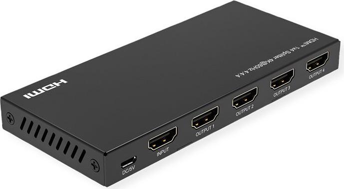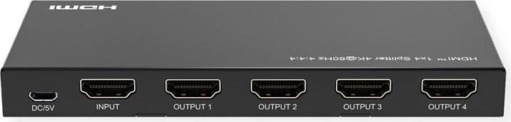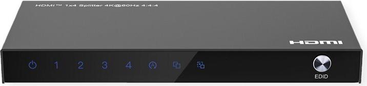 Video-Verteiler stellt den Video-Output von einer Video-Quelle auf vier Monitoren oder Projektoren dar. Für den Einsatz bei Präsentationen bzw. zu Schulungszwecken Vervielfältigt ein HDMI Videosignal, z.B. von einem DVD-Spieler, auf 4 Ausgabegeräte mit 4K-Auflösung Anschlüsse: 1x HDMI Eingang, 4 HDMI Ausgänge Unterstützt max. 3840 x 2160 (@60Hz) Unterstützt 3D EDID Wahlschalter Einfache Installation und Bedienung Es wird keine Software benötigt Spannungsversorgung via USB-Kabel (A - microB)Hohe Auflösung bis zu 4K@60Hz YUV 4:4:4 und Full 3D VideoformatHDCP 2.2 und HDCP 1.4 / High Dynamic Range (HDR) video.Bandbreite von 600MHz/6Gbit/s pro Kanal (18Gbit/s alle Kanäle) / 12 Bit pro Kanal (36 Bit alle Kanäle) Farbtiefe3 verschiedene EDID-Modi: Auto / Copy / Downscaler:1. Normaler Auto EDID-Modus: Ruft die niedrigere Auflösung und das Audioformat beider Ausgänge für das Eingangsgerät ab, um das Signal an beide Ausgänge auszugeben2. Copy EDID-Modus:Kopiert die Auflösung und das Audioformat von Ausgang 1 für das Eingangsgerät, um dieses Signal an alle Ausgänge auszugeben3. Downscaler EDID-Modus:Gemischte Auflösungen werden unterstützt. Bei zwei Bildschirmen mit gleichen Bildwiederholraten, aber unterschiedlichen Auflösungen, kann eines der beiden Ausgangssignale von 4K auf 1080p herunterskaliert werden.