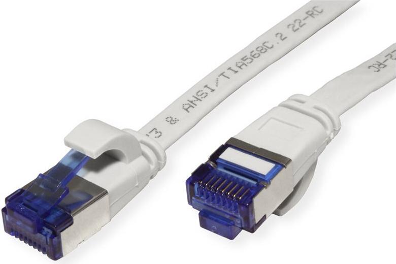 Konfektioniertes geschirmtes Patchkabel der Kategorie 6A mit RJ-45 Steckern beidseitig. Extra-flaches Netzwerkkabel für Verwendung bei beschränkten Raumverhältnissen. Strapazierfähig dank angespritztem Knickschutz Als Rangierkabel in Patchfeldern oder als Geräteanschlusskabel geeignet und für die Anwendung im LAN vorgesehen Für den Einsatz in 10-Gigabit-Ethernet-Netzwerken geeignet Kontaktbelegung: 1:1 gemäss EIA/TIA568, 8 Adern Aufbau: 8 Adern Litze. Paarweise Schirmung: Aluminierte Folie Vergoldete Kontakte.