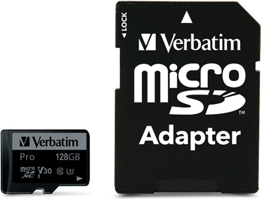 Verbatim PRO - Flash-Speicherkarte (microSDXC-an-SD-Adapter inbegriffen) - 128GB - Video Class V30 / UHS-I U3 / Class10 - 300x/600x - microSDXC UHS-I (47044)