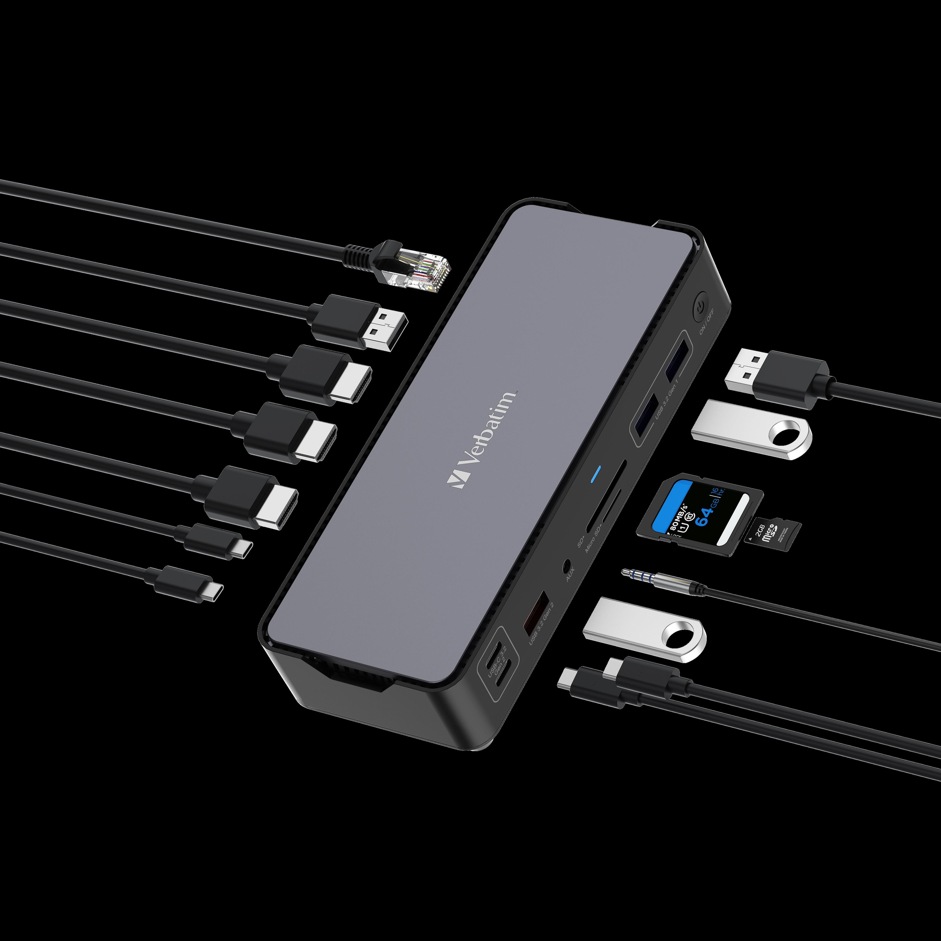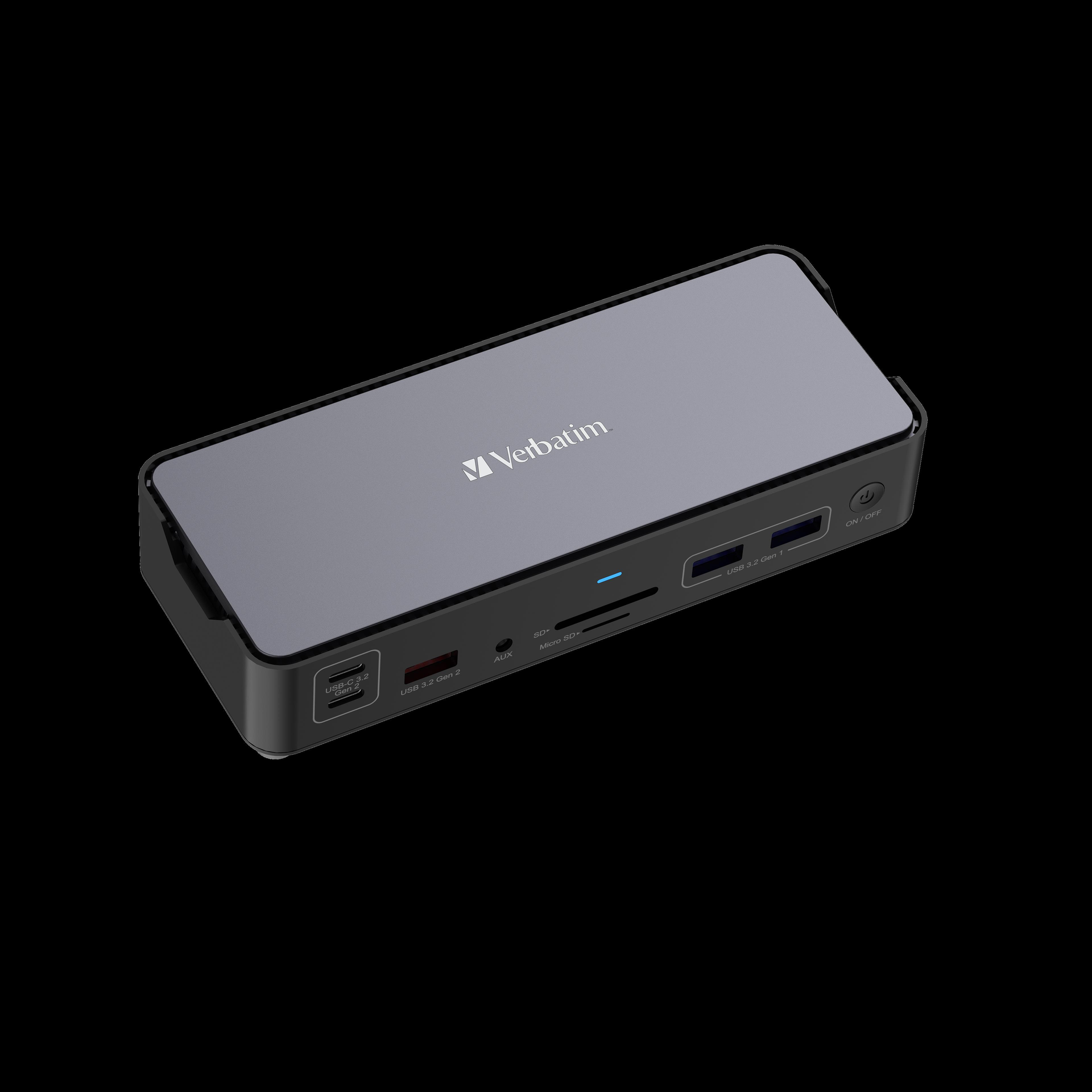 Die Verbatim Pro-Dockingstation ist eine umfassende Lösung, die den Anforderungen von Profis und Power-Usern gleichermaßen gerecht wird. Mit ihrer robusten Leistung von 100 W sorgt sie dafür, dass Ihre Geräte den ganzen Tag über aufgeladen bleiben. Die Dockingstation unterstützt hochauflösende Bildschirme mit bis zu 8K auf einem einzelnen Bildschirm und 4K auf drei Bildschirmen und ist damit perfekt für Arbeit und Freizeit geeignet. Die Vielzahl an Anschlüssen, einschließlich HDMI, DisplayPort, USB-C und mehr, bietet vielseitige Anschlussmöglichkeiten für eine breite Palette von Geräten und Peripheriegeräten. Darüber hinaus sorgt die Integration von Ethernet-, Fast Ethernet- und Gigabit Ethernet-Funktionen für zuverlässige Hochgeschwindigkeits-Netzwerkverbindungen. Für diejenigen, die häufig mit digitalen Medien arbeiten, bieten die integrierten SD- und microSD-Kartenleser bequemen Zugriff auf Dateien und Fotos. Ganz gleich, ob Sie im Büro oder von zu Hause aus arbeiten, die Verbatim Pro Dockingstation wurde entwickelt, um Ihre Produktivität und Ihr Multimedia-Erlebnis zu verbessern.