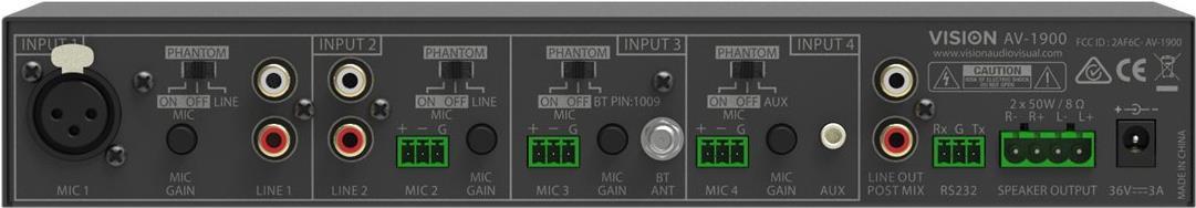 | Anschlusstyp | 2 x Audio Line-In (RCA Phono x 2) Mikrofon (XLR) 3 x Mikrofon (Klemmleiste) Audio Line-Out (RCA Phono x 2) Seriell (Klemmleiste) |