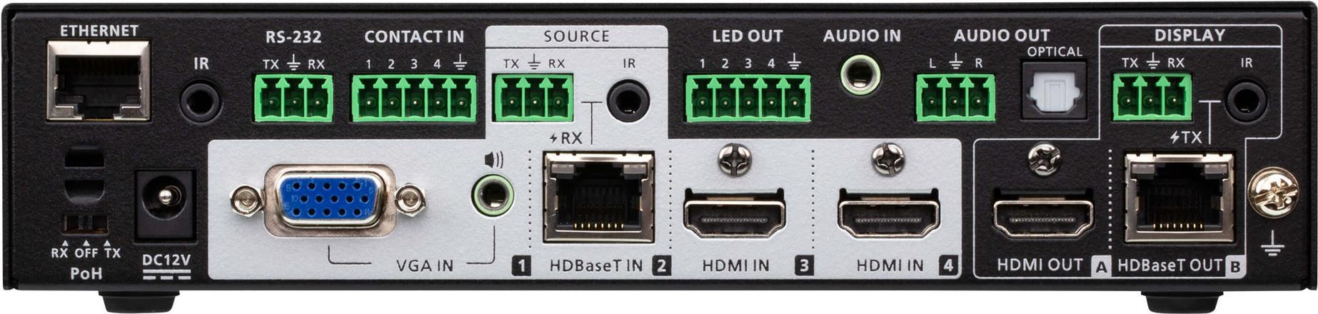 | Schnittstellen | 2 x HDMI-Eingang Type A 2 x HDMI-Ausgang Type A 1 x seriell (RS-232) 3-poliger Anschlussblock 1 x Fernsteuerungseingang (IrDA) mini-jack 1 x VGA-Eingang HD-15 2 x Audioeingang mini-jack 1 x Audioausgang 3-poliger Anschlussblock 1 x contact closure 5 polige Anschlussleiste 1 x LAN RJ-45 1 x HDBaseT-Eingang RJ-45 1 x HDBaseT-Ausgang RJ-45 1 x Fernbedienung (IrDA) Ausgang mini-jack 1 x TOSLINK-Ausgang |