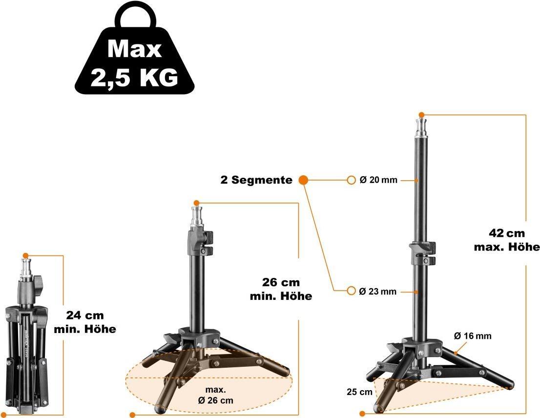 Klein und niedlich beschreibt das walimex Lampenstativ zwar sehr gut, darüber hinaus zeichnet sich der Artikel aber durch sehr viel mehr als seine geringe und kompakte Größe aus. Denn das, was die \"Großen\" nicht schaffen, macht das Lampenstativ 40 cm mit links, nämlich die Lichtsetzung von unten. Durch die Mittelspinne steht das Stativ sehr stabil und dank der gummierten Füße auch rutschfest. Mit einer maximalen Belastbarkeit bis 2,5 kg lassen sich kleinere Lampen, Blitze und Kompaktblitze anbringen. Die geringe Transportlänge sorgt dafür, dass das Stativ in jeder Fototasche Platz findet und auch in Ihrem Studio nicht viel Platz wegnimmt!
