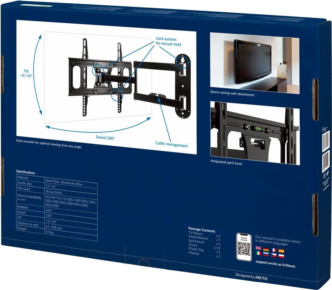 Zwei Arme, drei Gelenke, unzählige Möglichkeiten. Die Full-Motion-Wandhalterung setzt dem Starren ein Ende und eröffnet Raum für neue Perspektiven. Mühelos um 360° drehen, 180° schwenken, und um +5/-10° neigen: Mit dem TV Flex M sind der perfekten Positionierung des Fernsehers keine Grenzen gesetzt, für beste Sicht aus allen Winkeln.