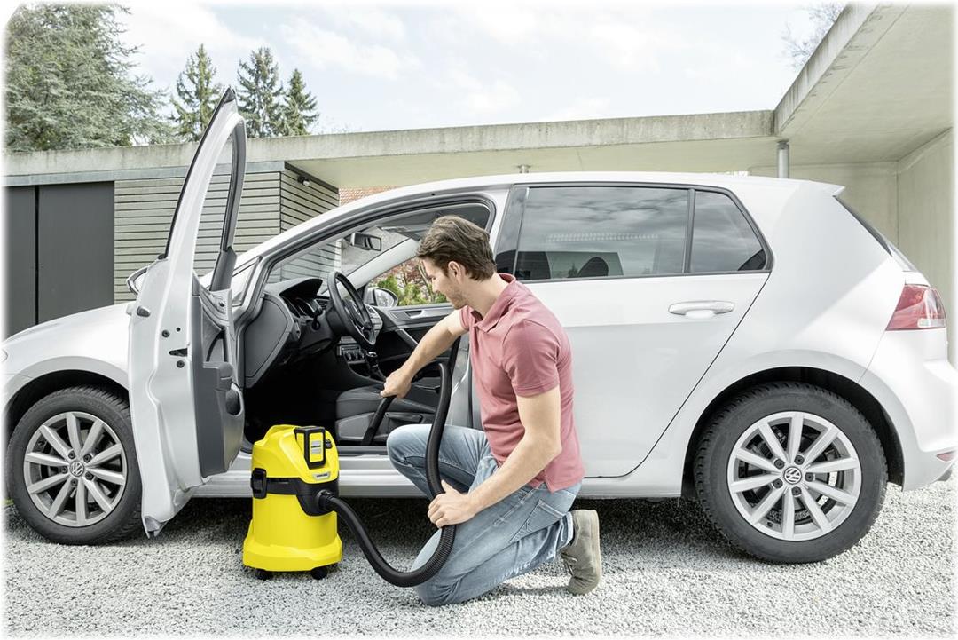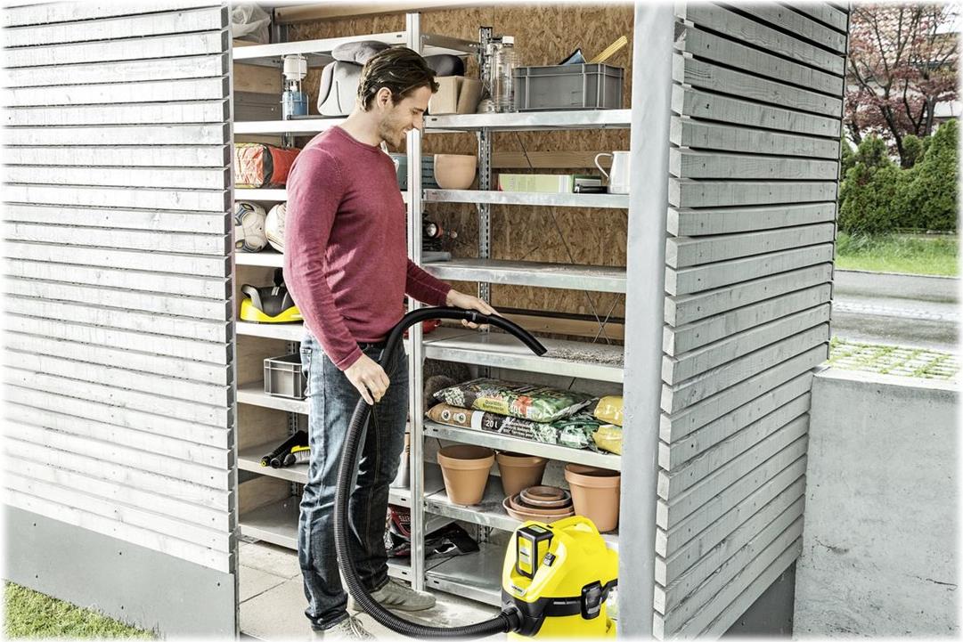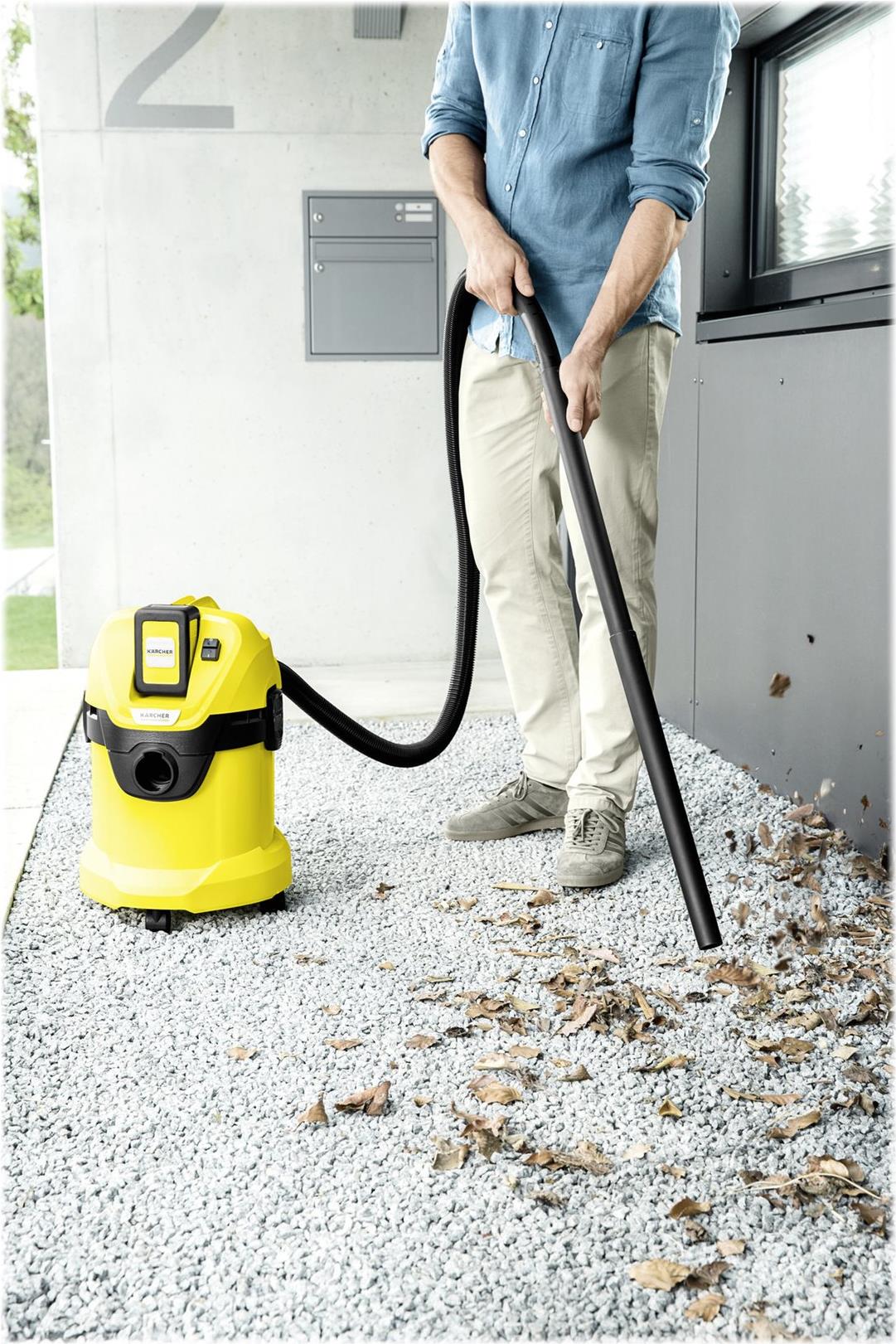 Der WD 3 Battery ist so funktional wie ein Mehrzwecksauger mit Kabel, braucht aber keinen Stromanschluss. Die Akkulaufzeit beträgt je nach Akku 15 bis 30 Minuten. Der flexible Akku-Mehrzwecksauger verfügt zudem über einen robusten und stoßfesten Kunststoffbehälter mit 17 Liter Fassungsvermögen sowie einen Patronenfilter zum bequemen Aufsaugen von trockenem und nassem Schmutz ohne Filterwechsel. Der strömungsoptimierte Saugschlauch und die clevere Clips-Bodendüse mit Mischeinsatz tragen entscheidend zu einer optimalen Schmutzaufnahme bei und sorgen für restlose Sauberkeit. Praktisch ist auch der abnehmbare Handgriff, der die Zubehöranbringung direkt am Saugschlauch ermöglicht. Bei Arbeitsunterbrechungen können Saugrohr und Bodendüse dank Parkposition bequem zwischengeparkt werden. Zusätzliche Extras wie die Blasfunktion, das "Pull 'n' Push"-Verschlusssystem, der ergonomische Tragegriff und die äußerst praktische Zubehöraufbewahrung machen die Arbeit mit dem WD 3 Battery zum reinsten Vergnügen.