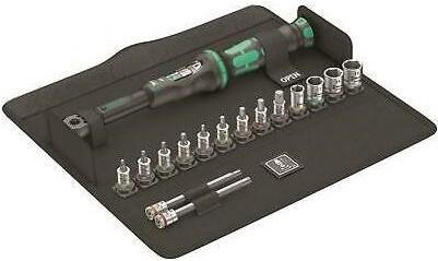 Das 16-teilige Set vom Schraubwerkzeugspezialist Wera löst die wichtigsten Schraubprobleme rund ums Fahrrad bei zuverlässiger Kontrolle der aufgebrachten Drehmomente zum Schutz der sensiblen Bauteile. Mit Klick-Drehmomentschlüssel im unverkennbaren Wera Design. Einfache Einstellung und Sicherung des Vorgabewertes. Das hör- und fühlbare Einrasten bei Erreichen der Skalenwerte erleichtert zusätzlich die sichere Einstellung des gewünschten Drehmomentwertes. Die robuste Auslösemechanik garantiert ein deutlich hör- und fühlbares Auslösesignal bei Erreichen des eingestellten Drehmomentes. Für Rechtsanzug und mit Umschaltknarre mit 45 Zähnen. Der Drehmomentschlüssel ist extrem platzsparend, ergänzt um, zum Drehmomentbereich passenden und auf die gängigsten Schraubverbindungen bei Fahrrädern angepassten, Zubehör, in einer robusten, oberflächenschonenden textilen Box verpackt.
