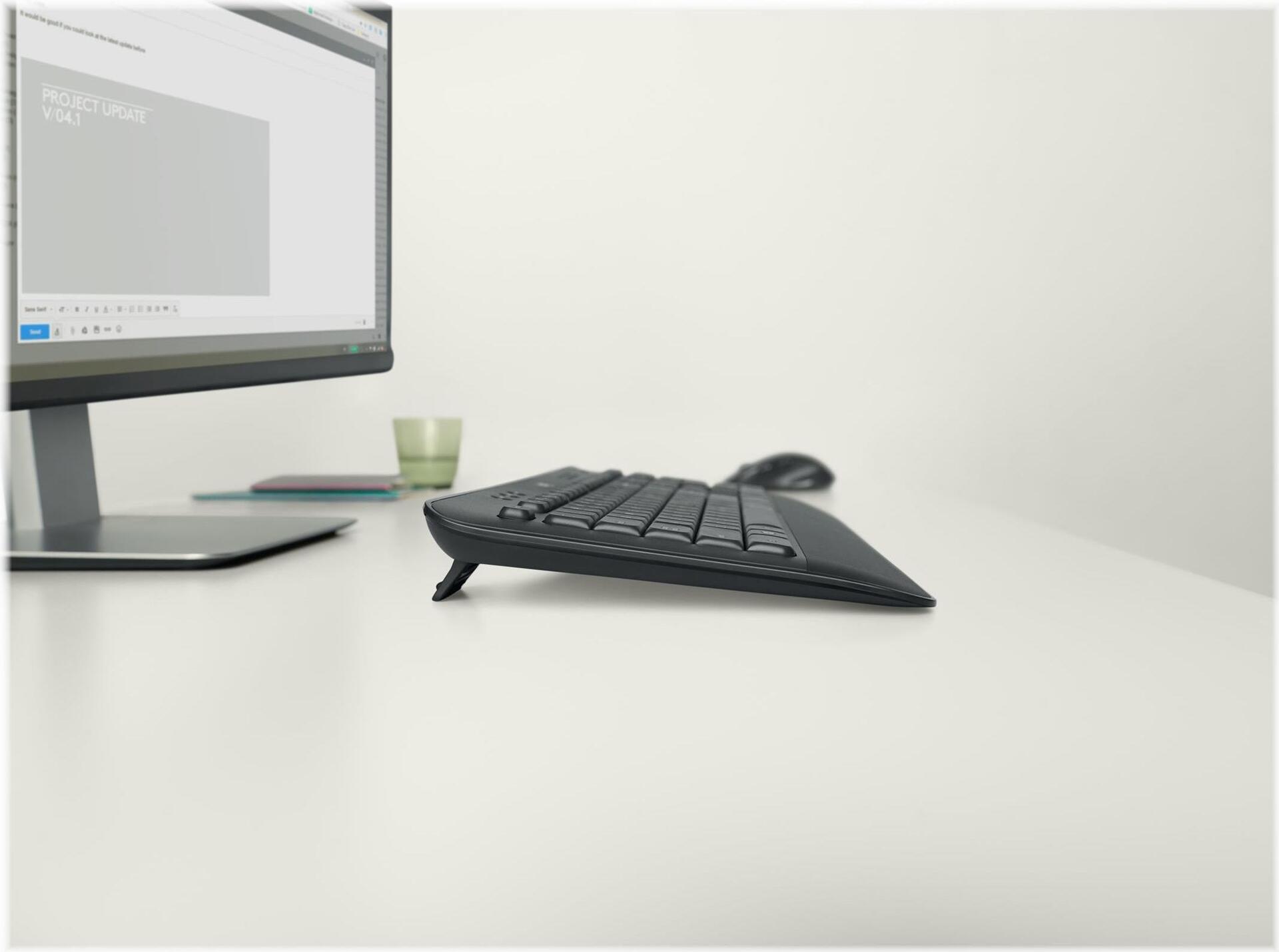Das MK545 Advanced ist eine kabellose Tastatur-Maus-Kombination, die sich durch Präzision, Komfort und Zuverlässigkeit auszeichnet. Die normalgroße Tastatur hat die vertraute Form, Größe und Haptik der Tasten - und die normalgroße, konturierte Maus bietet stundenlangen Komfort.