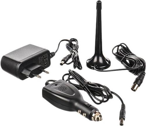 Das schlanke Gerät im stilvollen grauen Gehäuse hat eine Teleskopantenne mit Magnetfuß und ein KFZ-Ladekabel im Lieferumfang enthalten. Eine praktische Fernbedienung gehört ebenfalls dazu.